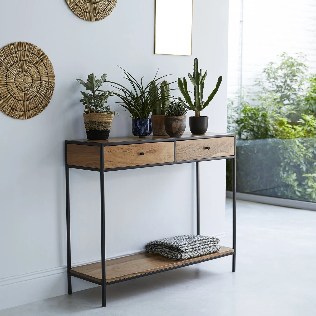 La console en mĂ©tal et bois d’acacia massif certifiĂ© FSC® 100 Agra interprète avec beaucoup de rĂ©ussite le style industriel.