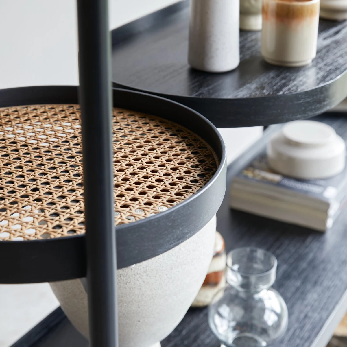 Si l’on est séduit par sa générosité de rangement et sa capacité à mettre en exergue vos plus beaux objets… on apprécie aussi beaucoup son mélange réussi de matière : au mindi verni foncé s’oppose la blondeur du cannage raffiné. Dans une entrée, le séjour, le salon ou un bureau… son design inventif fait écho à une esthétique venue d’ailleurs.