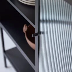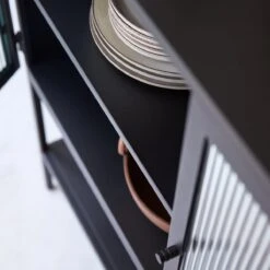 Envie de style sans tout changer dans la maison ? Le bahut en mĂ©tal Antonin permet de twister facilement l’atmosphère d’un lieu ! D’inspiration industrielle, il rĂ©ussit l’accord parfait de deux matĂ©riaux dissemblables : le mĂ©tal lisse protĂ©gĂ© par un revĂŞtement en poudre (qui ne gomme pas l’apparence nette du mĂ©tal) et le verre trempĂ© opaque qui laisse deviner sans dĂ©voiler ce qu’il contient. De très belle facture, ce bahut permet de ranger avec une Ă©lĂ©gance intemporelle, la vaisselle et le linge de table. Une tablette Ă la base autorise l’exposition de jolis objets… vous pouvez aussi dĂ©cider d’y placer des livres, des caisses d’objets. Les portes dotĂ©es d’une discrète poignĂ©e restent bien fermĂ©es grâce Ă des aimants judicieusement placĂ©s. Â