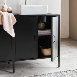 Le meuble de salle de bain en métal et manguier Arsène existe aussi en version 90 cm, idéal pour une petite salle de bain ou pour compléter des meubles déjà existants. Il est aussi proposé avec des portes grillagées : le meuble Romy 90 cm et sa version 140 cm.