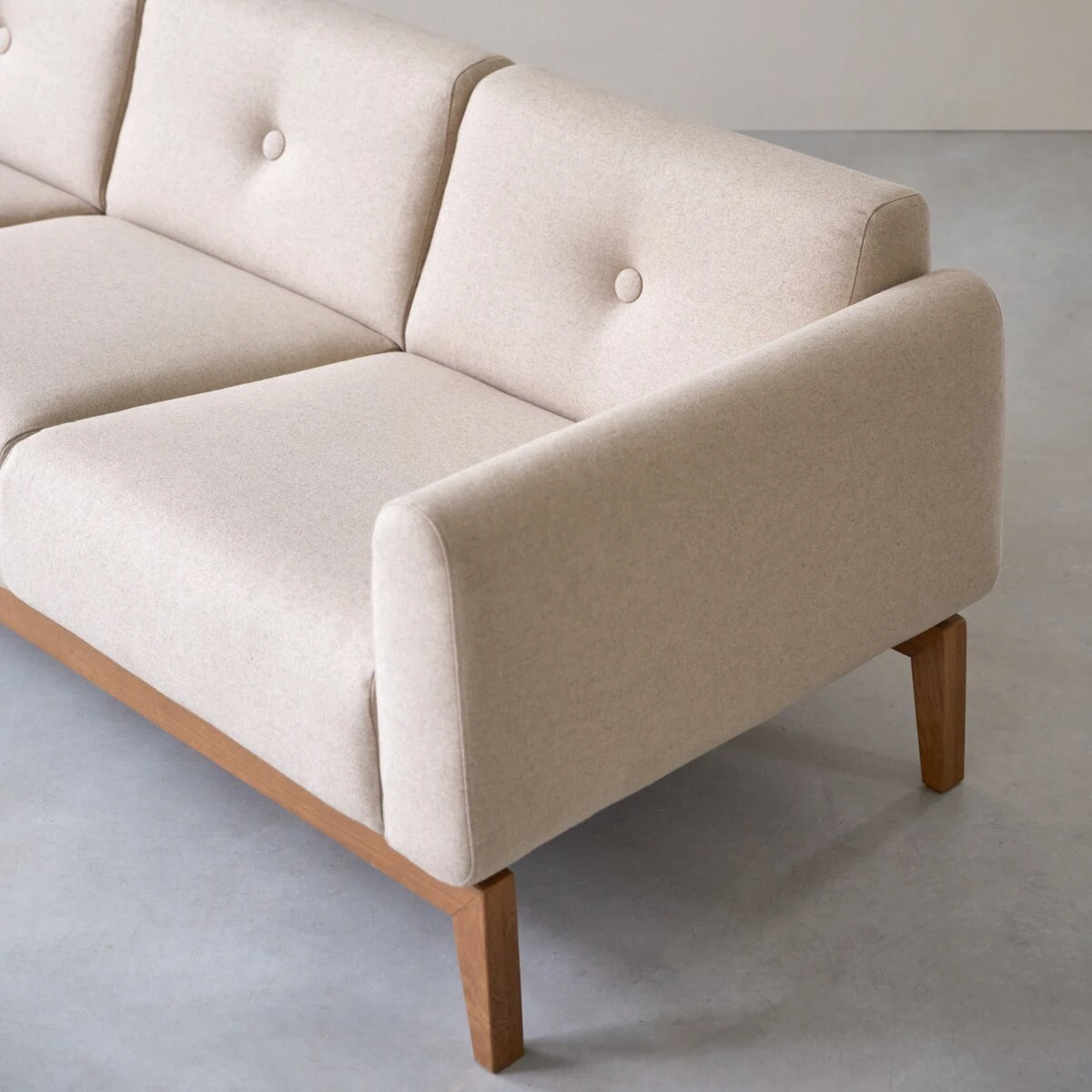 Pièce essentielle du salon, le canapé Bjorn écru illumine votre intérieur ! Ce meuble haut de gamme séduit par la perfection de son revêtement réalisé à base de laine recyclée, ce qui lui confère ce bel aspect chiné, par le traitement dont il a bénéficié pour être durable et résistant aux taches et par sa belle sobriété d’inspiration scandinave. On aime aussi le piétement en chêne massif européen, teinté et verni pour être facile à vivre au quotidien et la conception particulière de l’assise qui assure bon maintien et confort parfait !