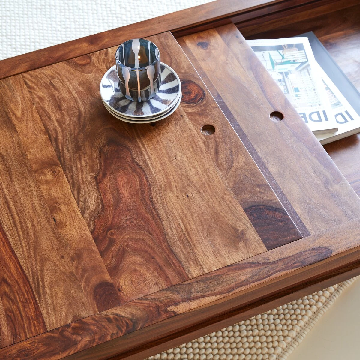 La table basse en sheesham Bonnie conjugue style actuel, ligne graphique et esprit pratique : son coffre de rangement accessible par un panneau coulissant dessus permet de ranger les petits objets du quotidien comme les télécommandes, les notices d’appareils vidéo ou même les paquets de snacks.