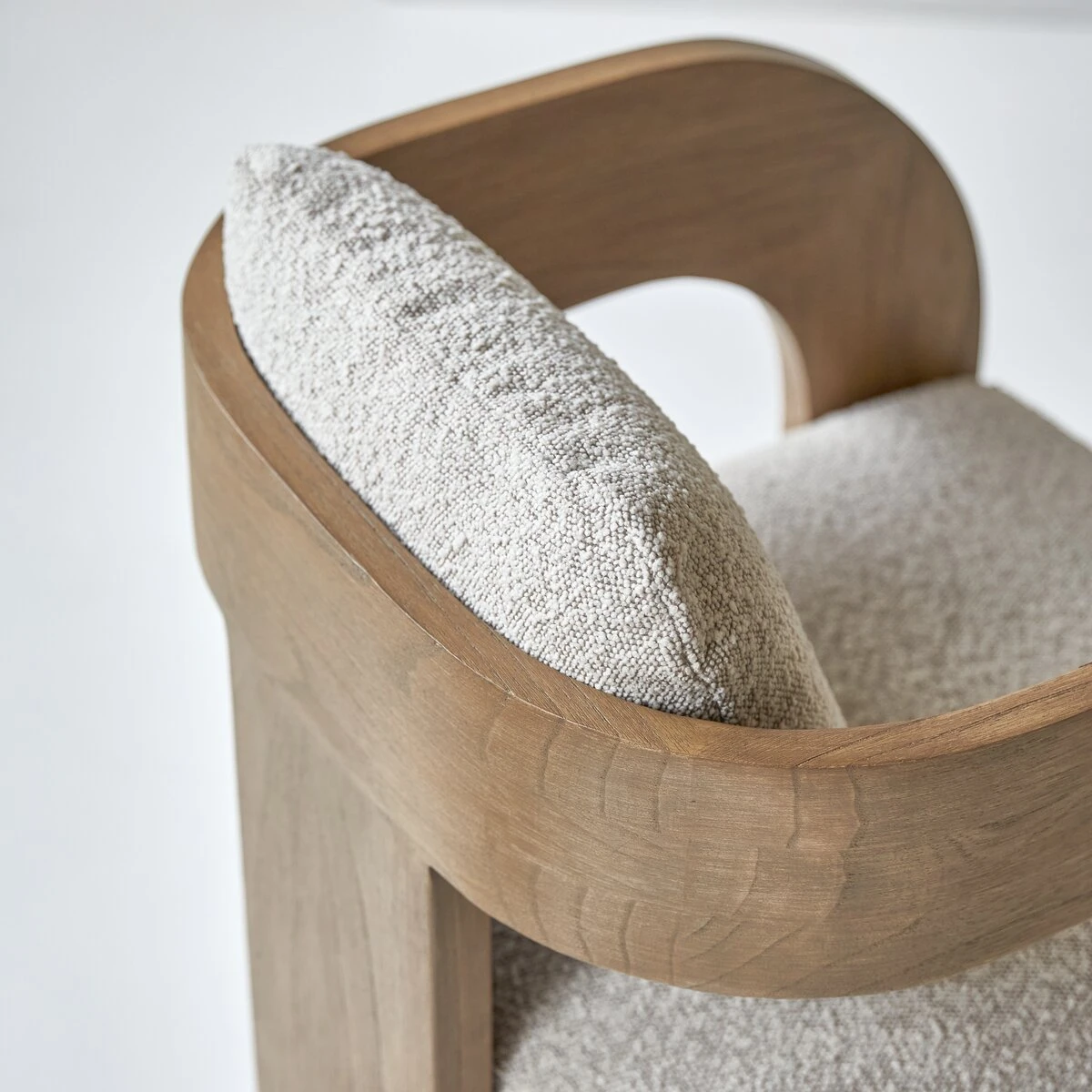 Pièce graphique et de caractère, la chaise Boti en mindi massif et tissu bouclĂ© est dĂ©clinĂ©e dans une version fauteuil Boti.Â