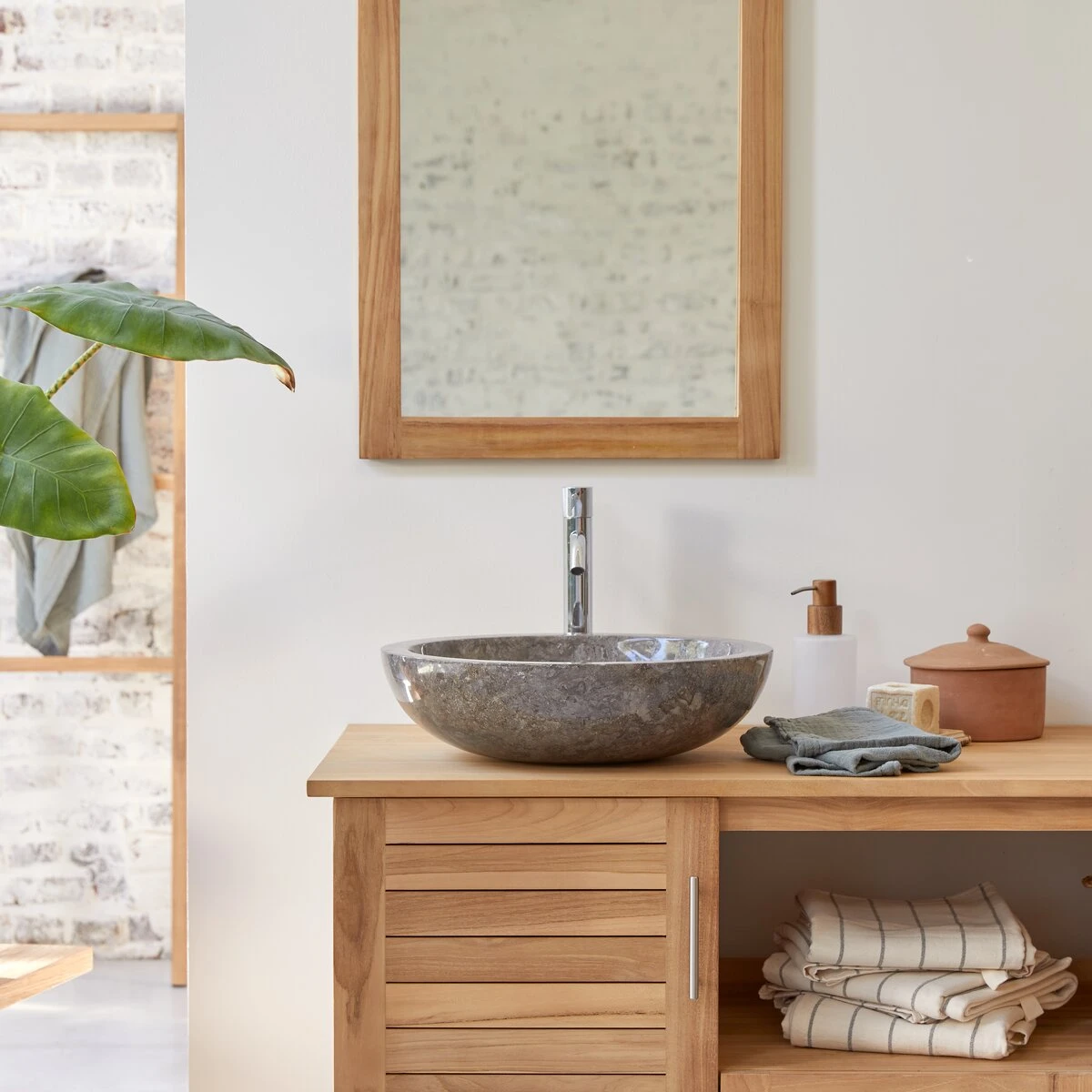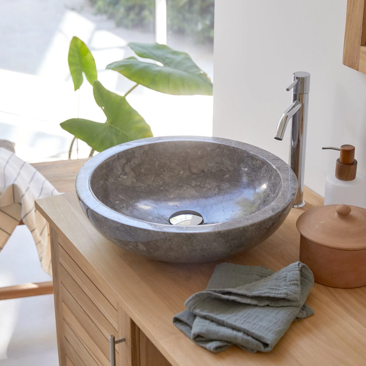 La vasque en marbre Calypso Grey s’adapte à toutes les installations européennes. Elle est présentée ici sur le meuble de salle de bain suspendu Romeo 120 en teck, mais peut, avec la même réussite se marier avec votre meuble de salle de bain existant.