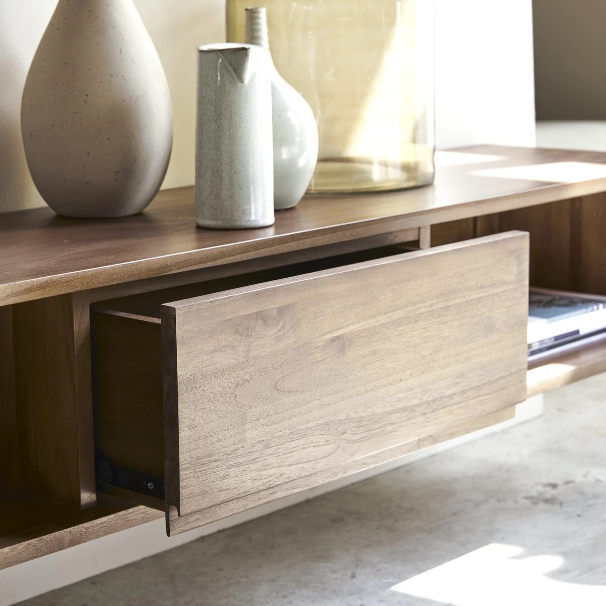 Le banc TV suspendu en teck Circa, existe aussi en version 3 tiroirs et en version 100 cm 2 tiroirs.