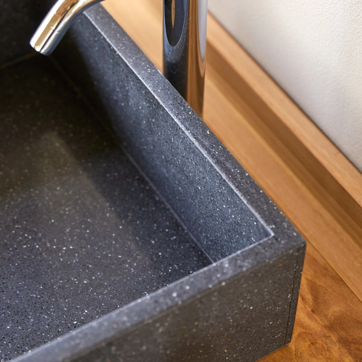La vasque en terrazzo premium Ciro s’installe dans toutes les pièces d’eau, même les plus petites.