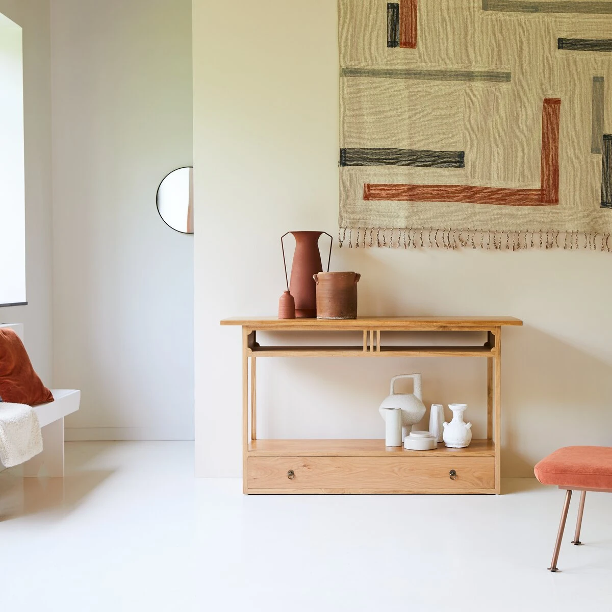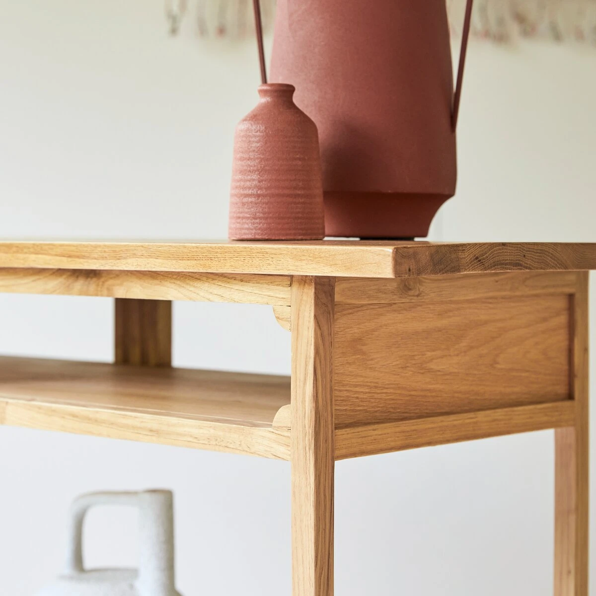 IdĂ©ale dans les piĂšces de vie, la console avec tiroir en chĂȘne massif Clovis trouve aussi sa place dans la chambre ou le bureau⊠Elle existe dans une version sans tiroir.