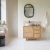 Pour les salles de bain de moindres dimensions, ce meuble existe aussi en version simple vasque 80 cm. Il vous est également proposé dans une version combinée à une vasque céramique ou à une vasque en pierre terrazo premium Pink, simple vasque ou double vasque.