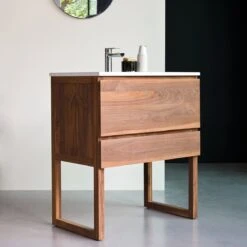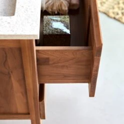 Le meuble de salle de bain Edgar en noyer massif et terrazzo premium Moon existe aussi en meuble double 120 cm. Il vous est également proposé associé à une vasque en céramique ou à une vasque en pierre Pink. Découvrez-le également en teck massif combiné avec différentes vasques : retrouvez toute notre collection Edgar.
