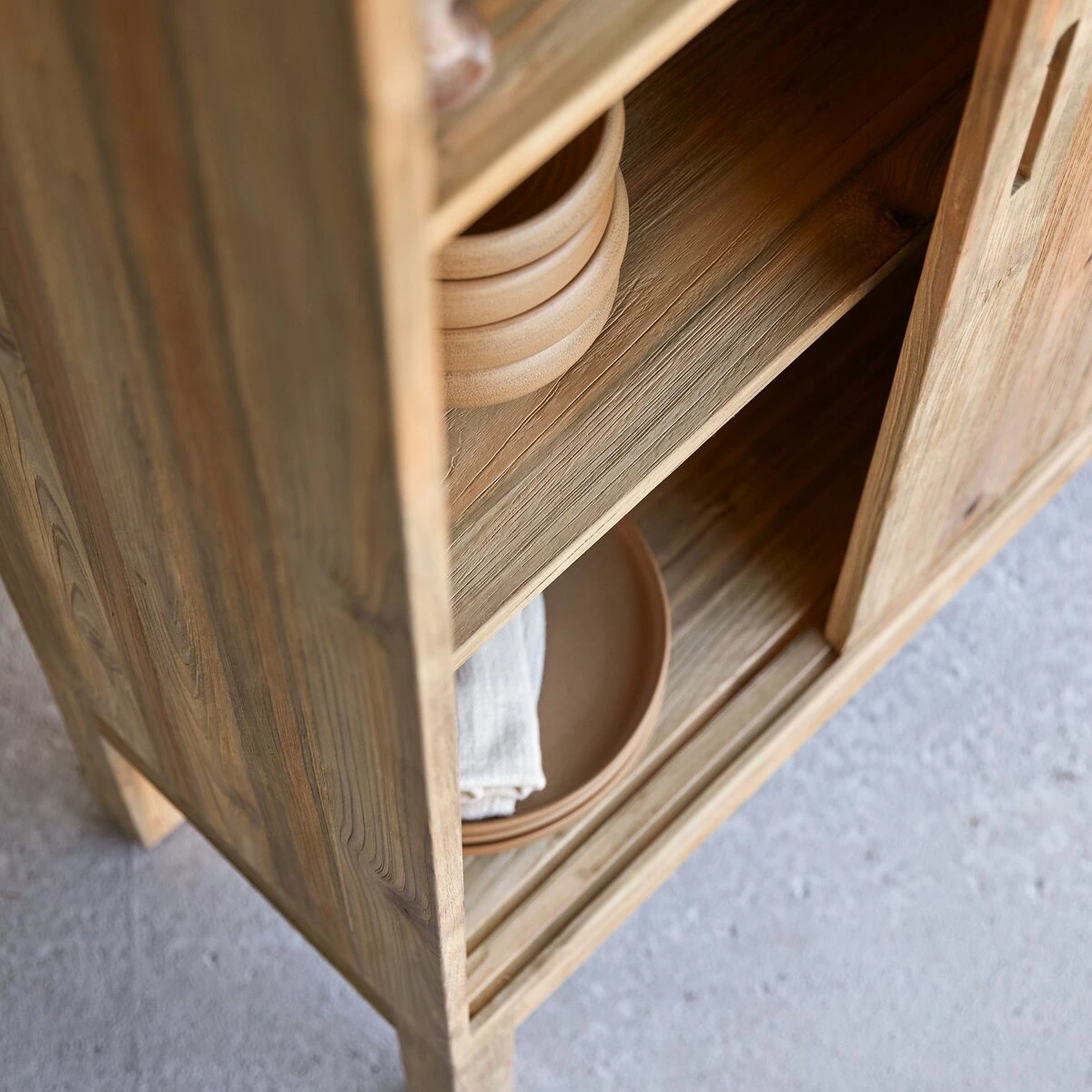 Parce qu’elle est bonne pour l’environnement et qu’elle nous raconte l’histoire de matĂ©riaux qui ont dĂ©jĂ vĂ©cu une première vie, la tendance upcycling est très en vogue dans les intĂ©rieurs contemporains. Le bahut en teck massif recyclĂ© Elias en fait la dĂ©monstration. TravaillĂ© dans un bois riche de souvenirs et certifiĂ© FSC® – la garantie qu’il provient de forĂŞts durablement gĂ©rĂ©es – il affiche une Ă©lĂ©gance minimaliste et un toucher singulier : la finition brossĂ©e permet de sentir la veine du bois sous la main.