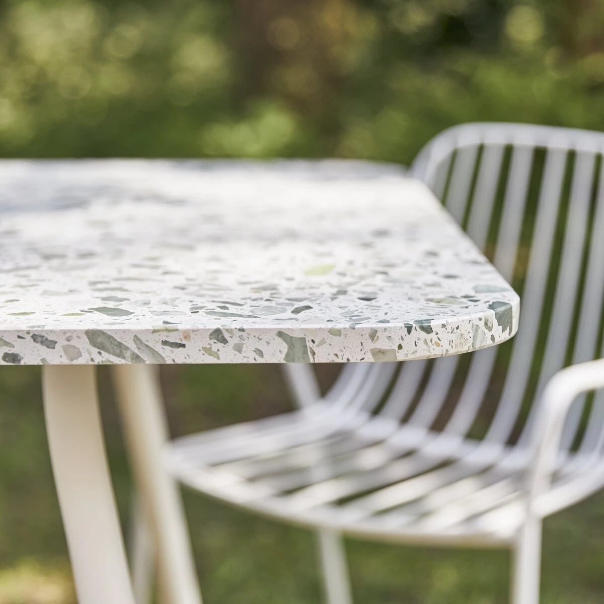 TrĂšs remarquĂ©e par lâesthĂ©tique singuliĂšre de son plateau mouchetĂ© et la qualitĂ© du matĂ©riau qui la compose, la table de jardin en terrazzo premium et mĂ©tal Elio green sĂ©duit par son allure contemporaine et sa facilitĂ© dâentretien : un simple coup dâĂ©ponge humide suffit Ă la rendre aussi belle quâau premier jour ! Le plateau est rĂ©alisĂ© dans un matĂ©riau ultra rĂ©sistant et durable, composĂ© Ă 80% de marbre et 20% dâun liant sans rĂ©sine. Le piĂštement en mĂ©tal galvanisĂ© termine avec modernitĂ© lâensemble. Â