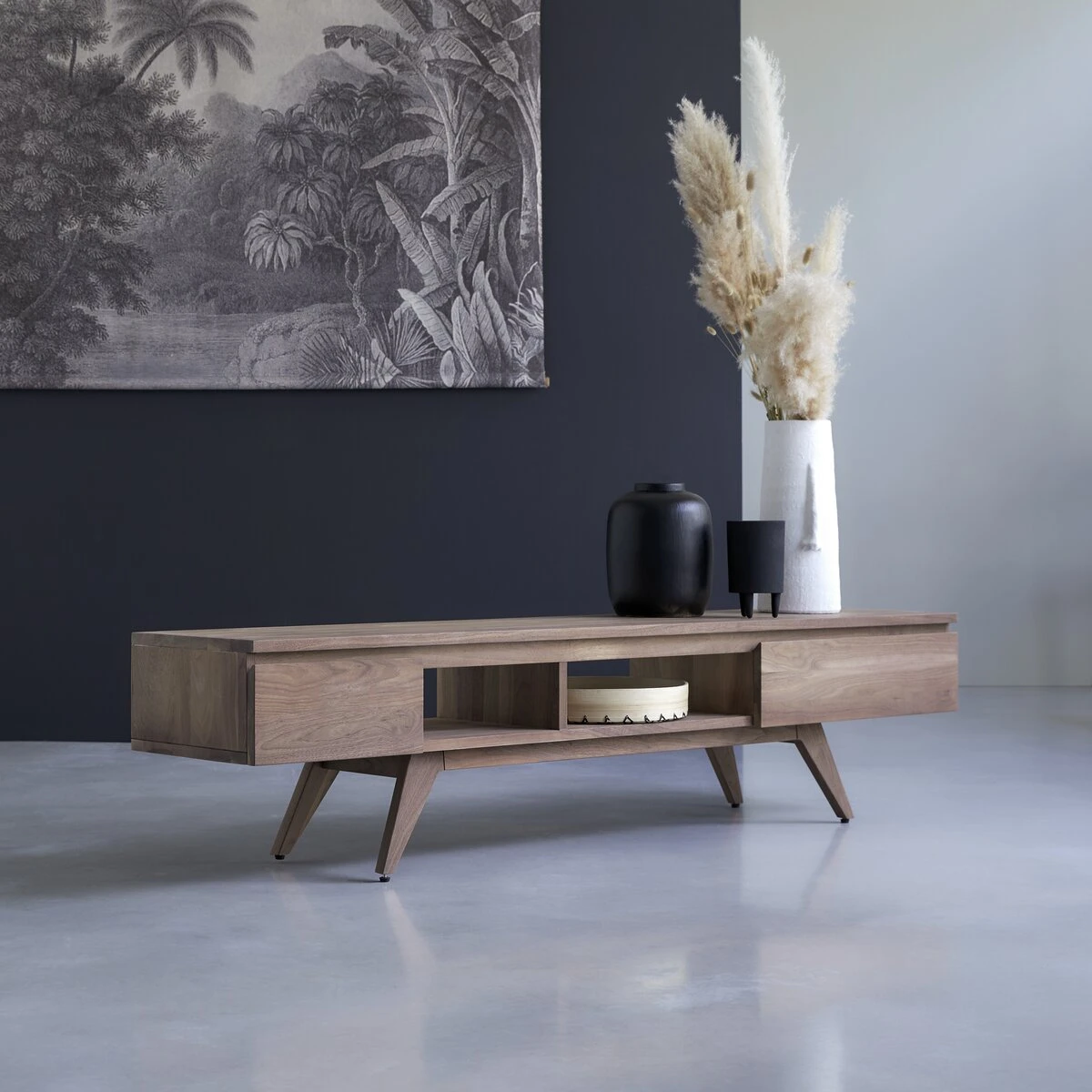Le banc TV en noyer massif Esmée vous séduira par la qualité de son bois noble, par ses reflets mordorés et son veinage apparent du plus bel effet et par ses lignes minimalistes au charme intemporel. Idéal dans tous les salons quel qu’en soit le style, il complète aussi avec brio une déco d’inspiration scandinave. Composé de 2 niches et 2 grands tiroirs pour organiser tous les accessoires multimedia, il reçoit sur le dessus le téléviseur et les autres appareils de grande taille.