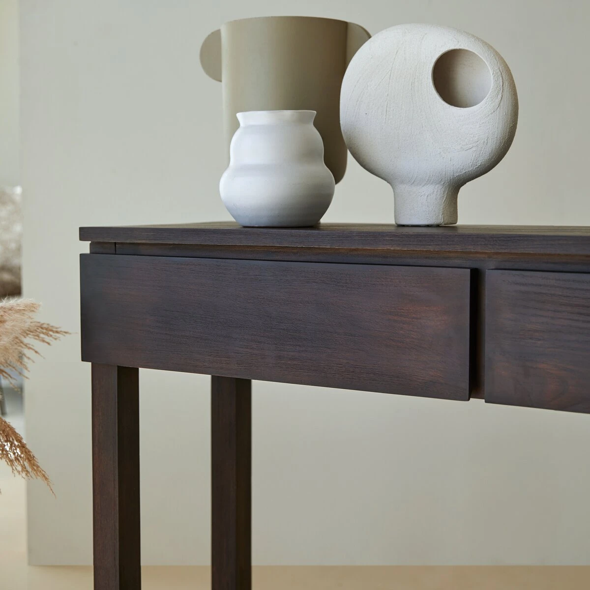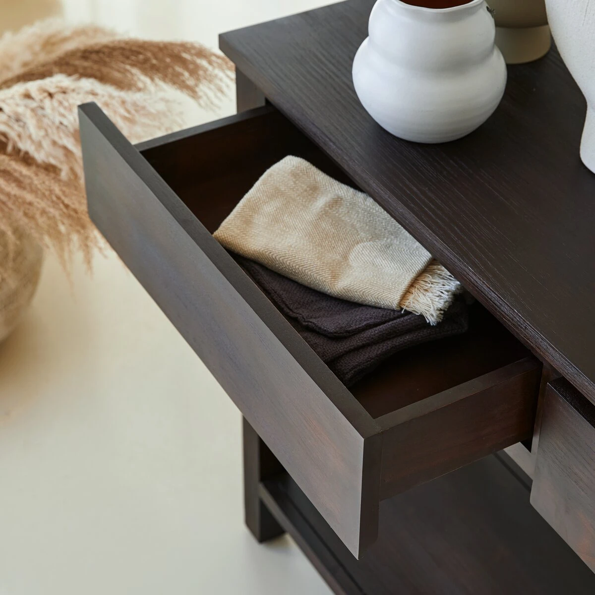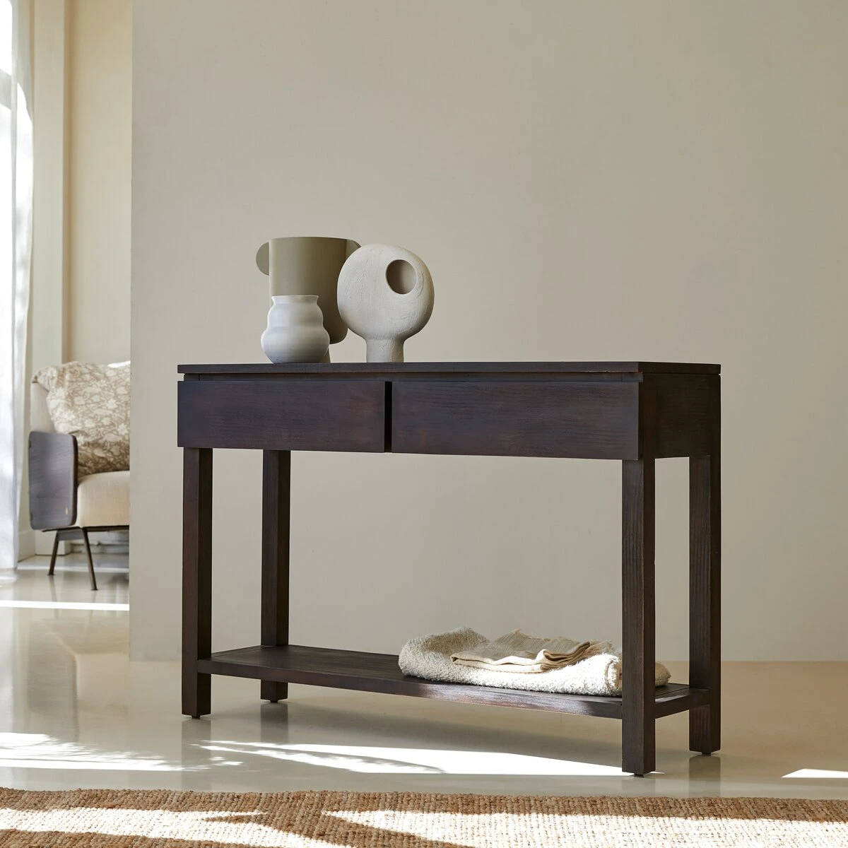 La console wengé en acajou massif certifié FSC® 120 Eva Biti trouve sa place partout dans la maison ! Au séjour, au salon, dans l’entrée ou le bureau… on y place objets de déco, plantes ou livres.