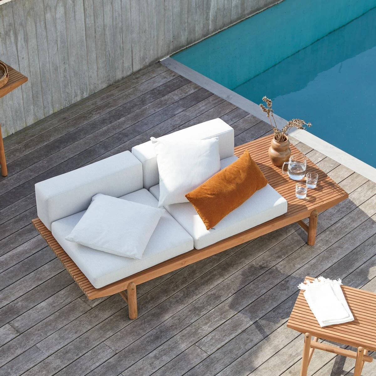 La frontière entre intérieur et extérieur est gommée : aujourd’hui on veut que le jardin ou la terrasse soit aussi élégant et naturel que le salon ou le séjour. L’extérieur devient alors une pièce supplémentaire de la maison. La banquette en teck massif Fado est parfaite pour répondre à cette nouvelle tendance. Non seulement elle offre des prestations de qualité : travaillée dans un bois noble verni réputé pour sa capacité de résistance aux intempéries et aux UV, elle a bénéficié de finitions particulièrement soignées et de visserie en laiton… mais en plus, elle affiche un design contemporain et une belle sobriété de lignes. On aime le très beau dessus latté, l’équilibre dessiné du piétement et les généreux coussins, déhoussables et lavables.