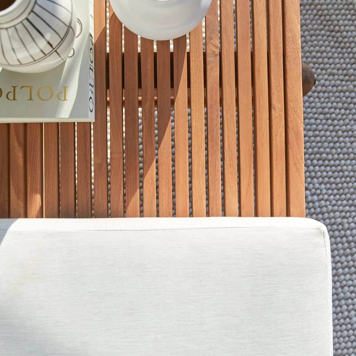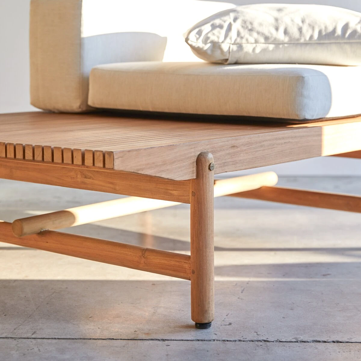 Une nouvelle façon d’envisager le salon : la banquette 1 place en teck massif Fado fait entrer l’esprit outdoor dans votre intérieur ! La tendance In & Out qui consiste à créer des meubles qu’on installe à l’intérieur comme à l’extérieur, est plus que jamais d’actualité : cette banquette premium en fait une évidente démonstration ! Travaillée dans un très beau bois verni, réputé pour ses qualités de résistance aux incidents du quotidien, à l’usure et aux intempéries, elle a fait l’objet de beaucoup de soins et ce, à toutes les étapes de fabrication. Résultat, le plan latté du plus bel effet, les finitions de qualité, les coussins déhoussables et lavables en machine et la visserie en laiton. Associée à la table basse Fado et à la banquette 2 places Fado, elle compose un salon plein de charme qui invite à l’évasion… un espace de détente modulable : vous installez les coussins comme vous en avez envie, le confort sera toujours au rendez-vous.