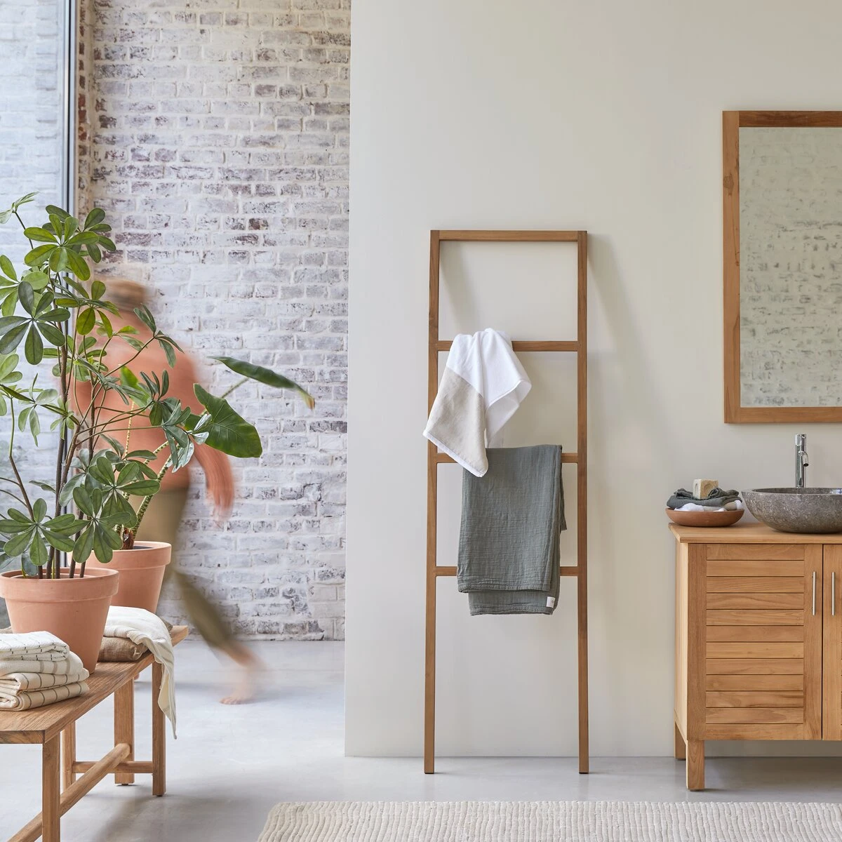 Ici, le modèle sur pied Galyno : pratique, cet accessoire en teck certifiĂ© FSC® est composé de 3 niveaux vous permettant d’y suspendre vos textiles.