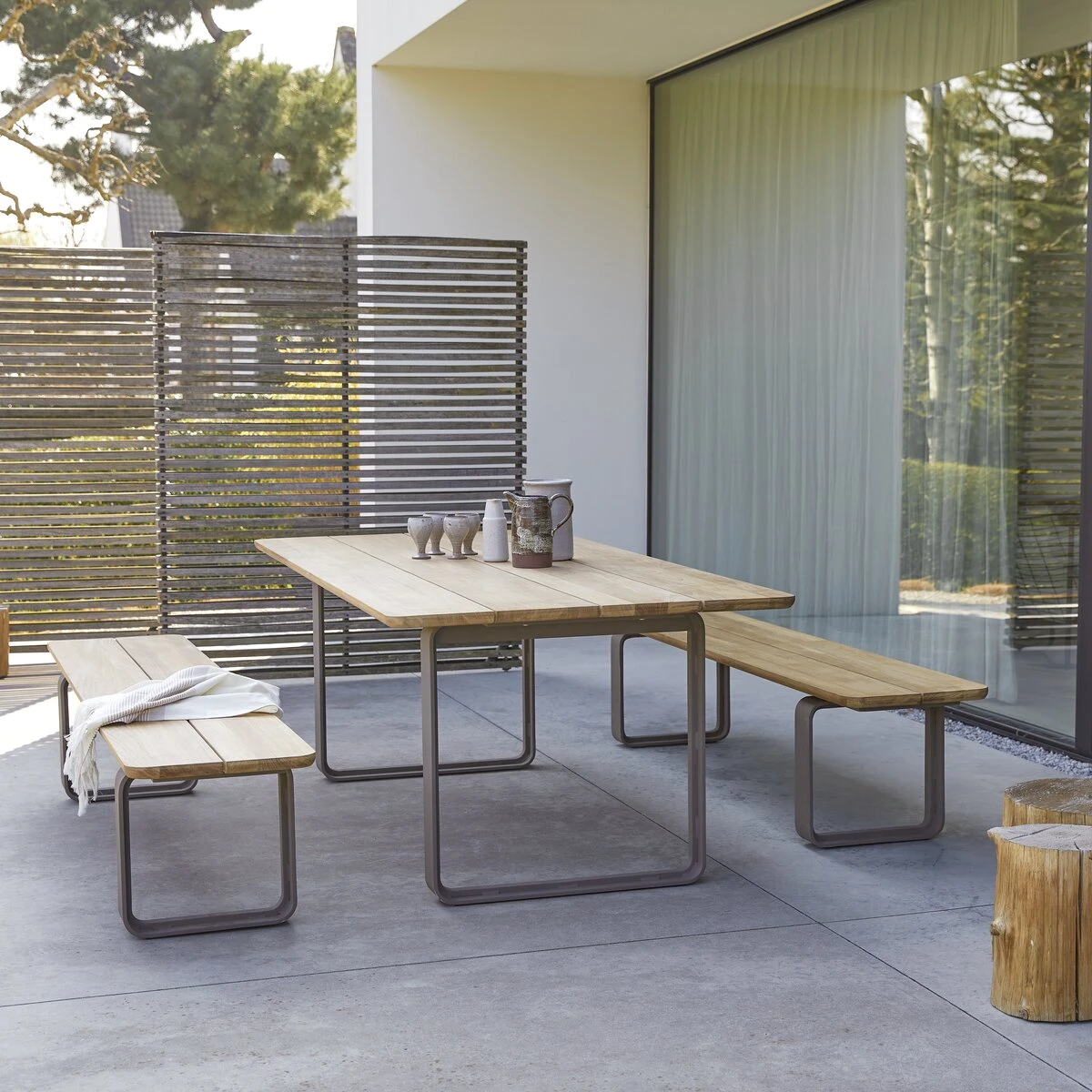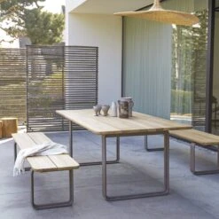 Un ensemble premium composé de 3 meubles au design contemporain et d’inspiration légèrement industrielle. Puisqu’aujourd’hui la maison s’ouvre au jardin et lui alloue le rôle d’une pièce à vivre supplémentaire, il est important de choisir avec soin le salon qu’on aura plaisir à retrouver saison après saison ! De très belle qualité, celui-ci est composé de 2 bancs et de la table en teck et aluminium Harper. L’ensemble joue à la perfection l’opposition des matières et la perfection des détails.