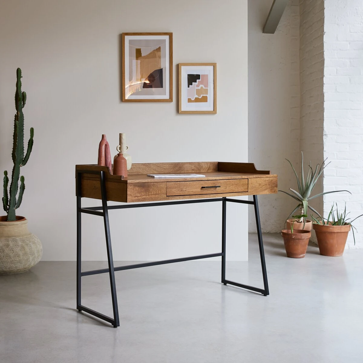 Le bureau en manguier massif et métal Hedda… comme une envie de voyage sans sortir de chez soi. On aime la légèreté de son design d’inspiration exotique, la finition laquée qui sublime la veine du bois massif et les belles proportions. Idéal dans la chambre pour se concocter un petit coin travail ou détourné en élégante coiffeuse, le bureau en manguier massif et métal Hedda aime jouer le contraste des matières !