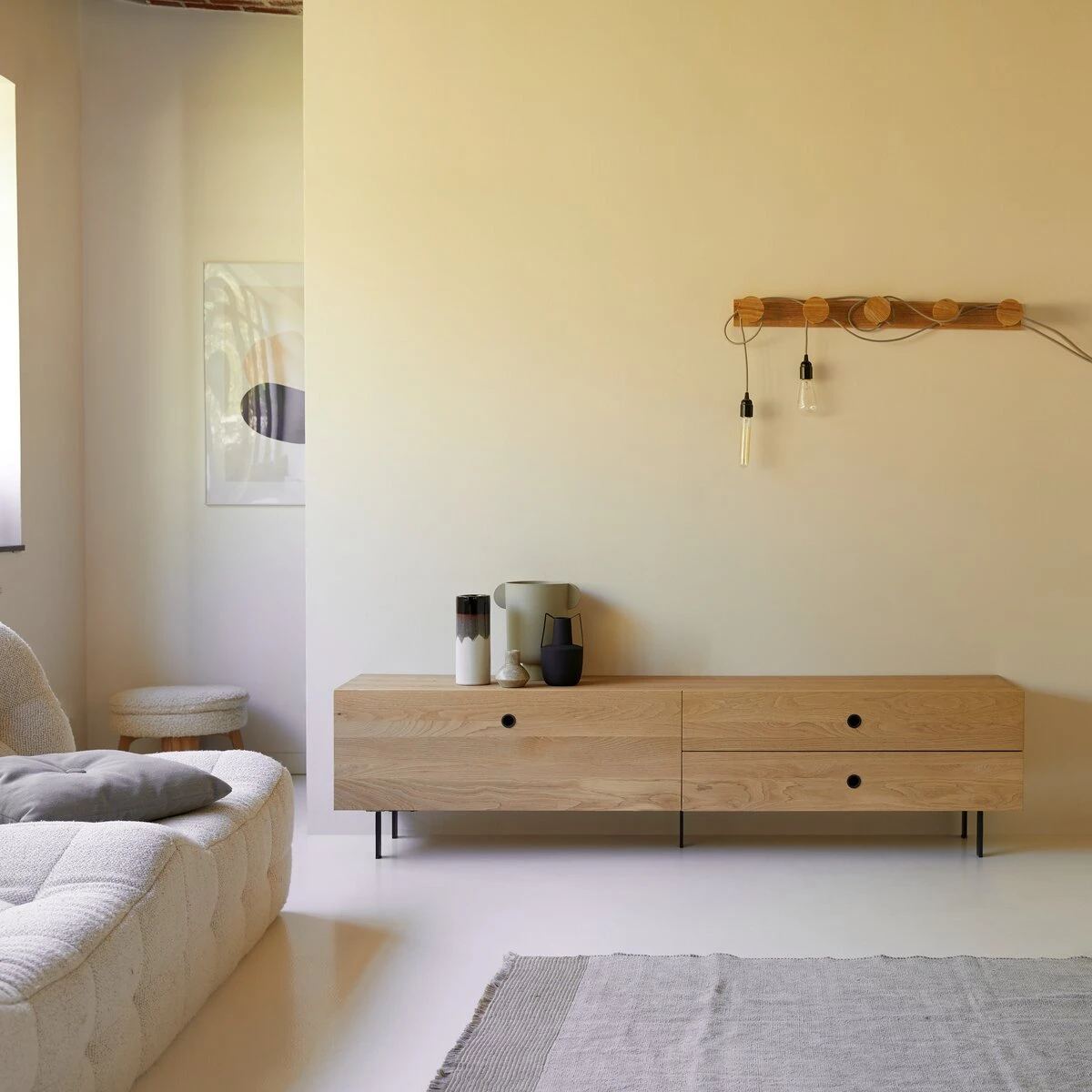 Un chĂȘne massif de trĂšs belle qualitĂ©, certifiĂ© FSCŸ pour ĂȘtre durable⊠une finition brossĂ©e du plus bel effet, le banc TV en chĂȘne Jeanne a tout pour vous sĂ©duire ! Issu du savoir-faire dâartisans passionnĂ©s, il affiche un assemblage en queue d’aronde, des poignĂ©es en acier mat et des pieds fins pour allĂ©ger visuellement le design.