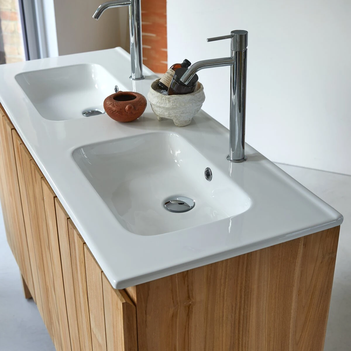 Le meuble en teck et céramique 120 Jill existe aussi en version une vasque.
