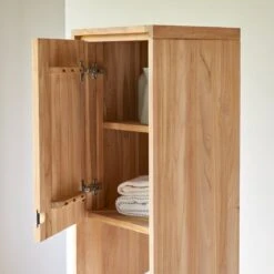 La colonne de salle de bain en teck massif Jonak complète Ă la perfection le meuble double vasque Jonak pour une pièce d’eau Ă l’esprit scandinave très affirmĂ©.