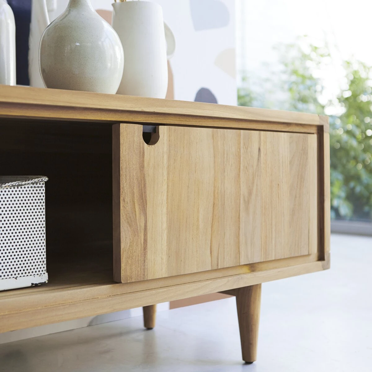 Notre meuble TV Jonà k est fabriqué en teck massif brut naturel. Véritable meuble de rangement, ses 2 portes coulissantes et sa niche vous permettront de mettre à disposition tous le nécessaire de votre piÚce. Il trouvera facilement sa place au salon comme au séjour, ce meuble de télévision en teck apportera une touche moderne à votre intérieur.