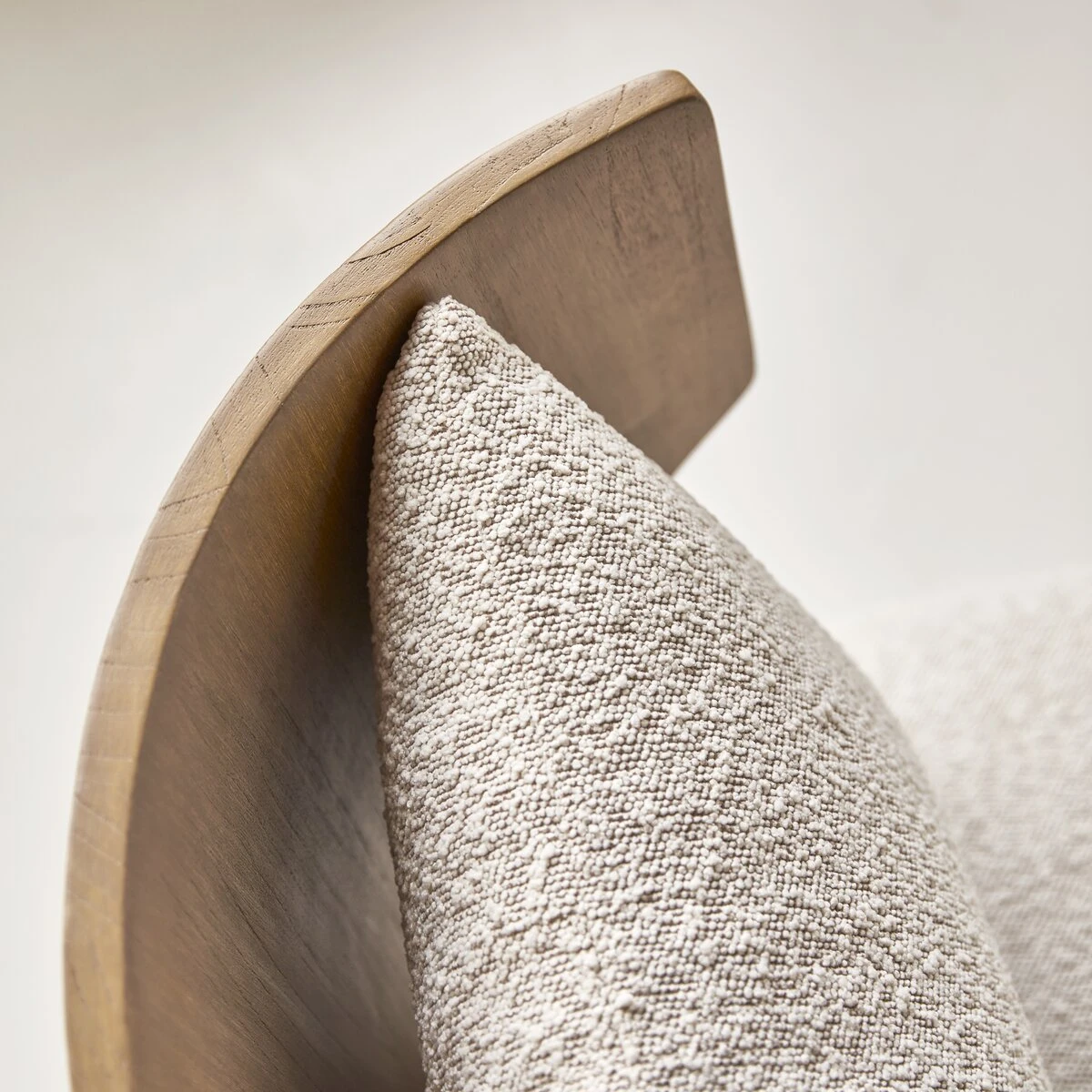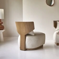 Le fauteuil June en mindi massif et tissu bouclĂ© vogue entre accents venus d’ailleurs et allure pop… pour un salon des plus remarquĂ©s !Â