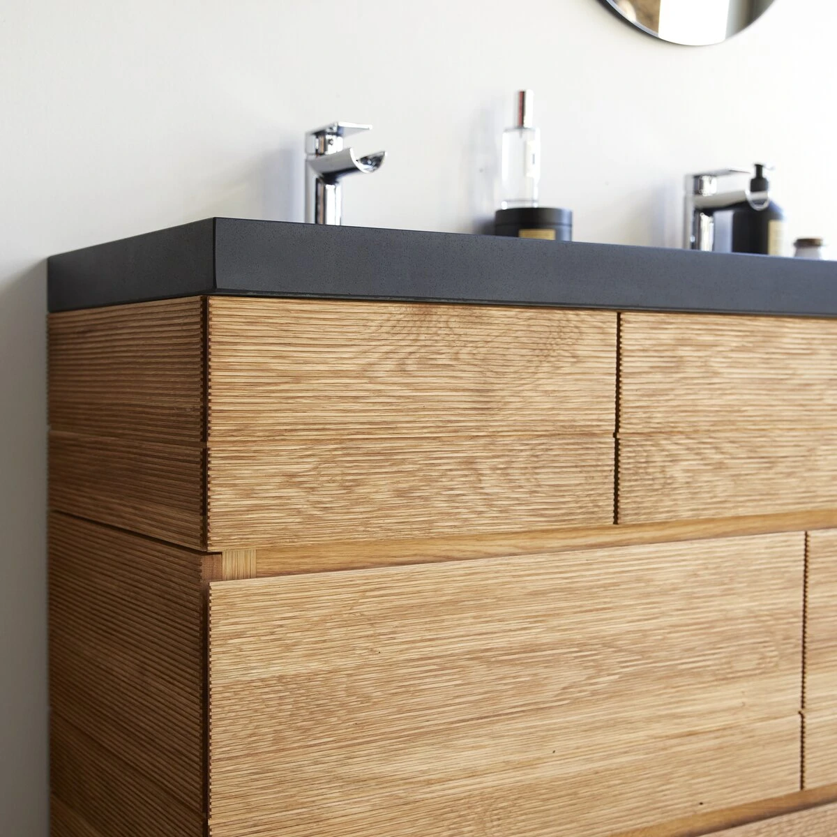 DĂ©couvrez notre meuble sous vasque Karl Duo en chĂȘne massif certifiĂ© FSCÂź et plateau en pierre de lave. Parfait meuble de rangement, il est Ă©quipĂ© de 4 tiroirs qui vous permettront de mettre Ă disposition votre linge de maison et vos produits de beautĂ©. Gain de place optimal : 2 en 1, grĂące Ă son large plan vasque est idĂ©al pour une salle de bain familiale.