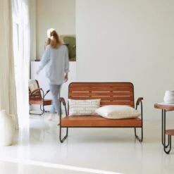 Le salon en acacia massif Key Wood cultive la tendance In and Out, qui privilégie les meubles aussi à l’aise à l’intérieur qu’à l’extérieur de la maison : au salon, ces fauteuils et banc se réchauffent de quelques coussins, d’un plaid… sur la terrasse, ils passent l’été au frais pour de longues soirées conviviales. D’inspiration industrielle, ce salon plein de personnalité est composé de 2 fauteuils + 1 banc + 1 table basse à double plateau. Toutes les pièces de cet ensemble bénéficient d’un traitement à l’huile pour en préserver la beauté et le rendre facile à vivre au quotidien. On aime l’étonnante association du métal et du bois, les lignes tout en rondeur et la conception lattée des assises, très en vogue dans les intérieurs contemporains.