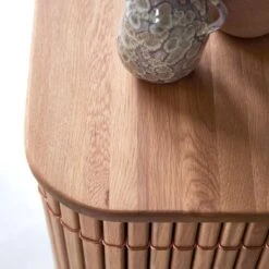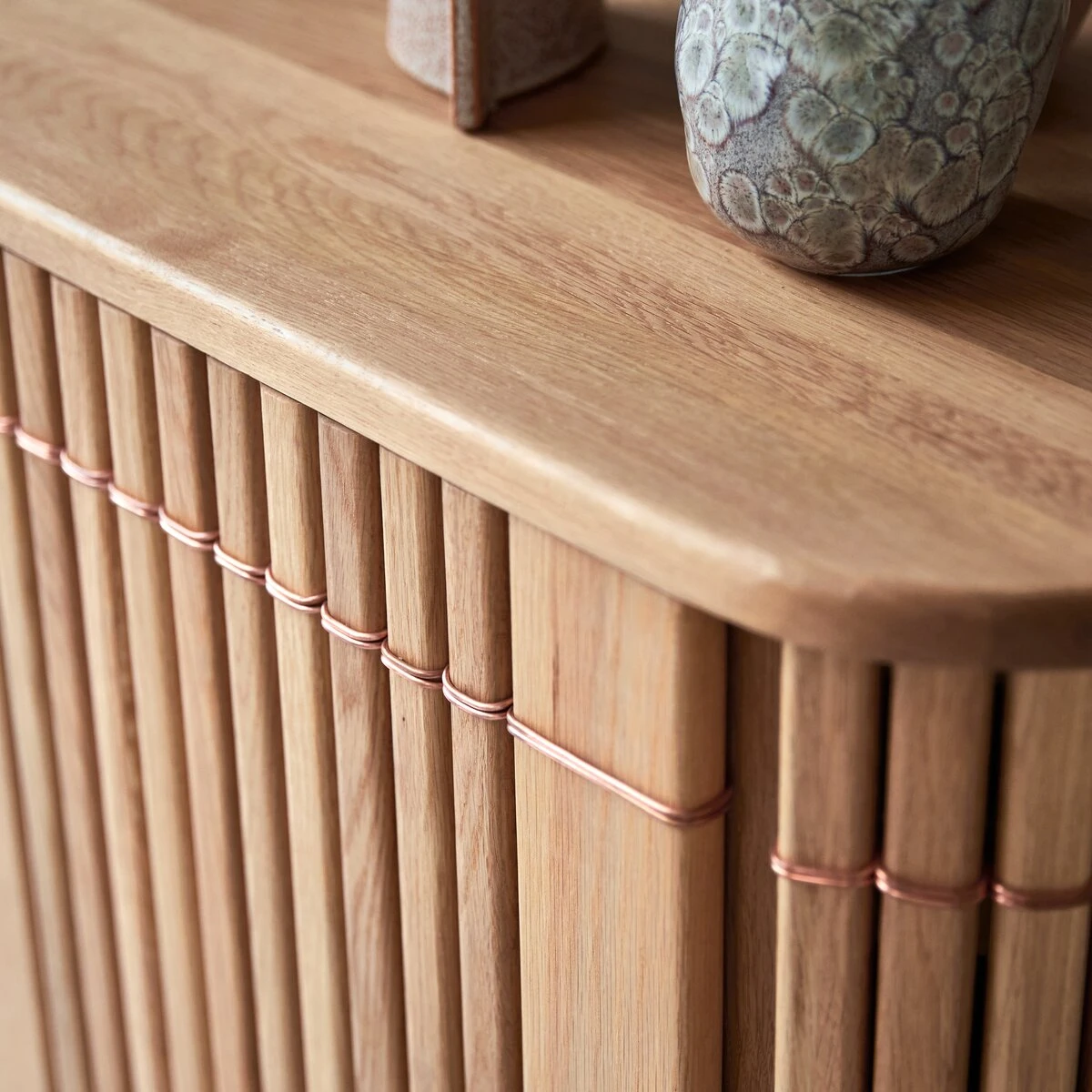 InspirĂ© du style Art DĂ©co dont il adopte la finesse et lâĂ©lĂ©gante sobriĂ©tĂ©, le buffet en chĂȘne 115 Koppar de Karpenter combine lâauthenticitĂ© dâun bois massif, le raffinement dâun fil de cuivre jouĂ© en touches et une superbe qualitĂ© de facture : chacune des lattes est montĂ©e Ă la main.