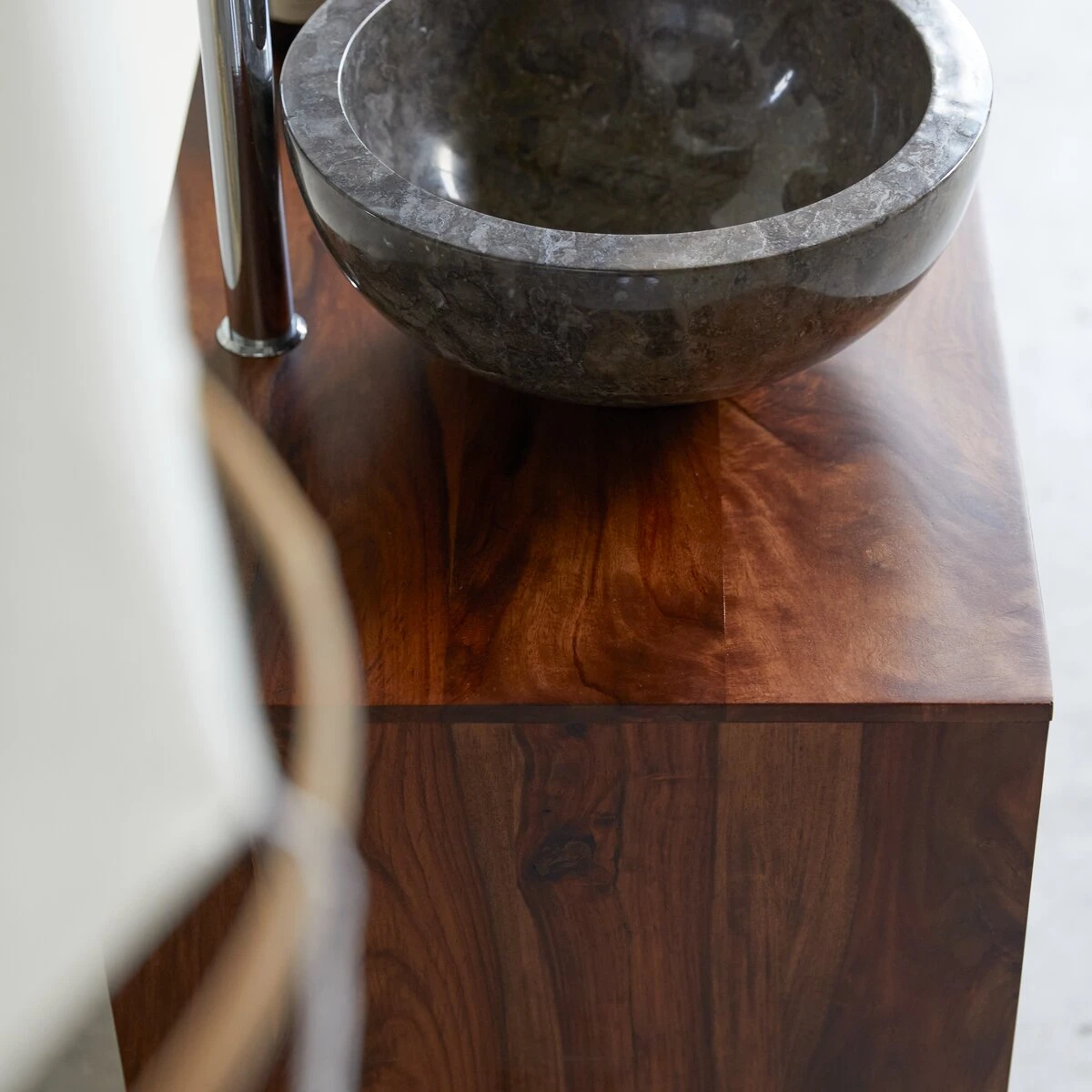 Grand meuble de salle de bain en palissandre aux lignes simples et modernes. Ce meuble sous vasque en bois massif est vendu avec 2 tiroirs façon ‘casier’. Très pratique, sa grande niche, vous permettra de ranger produits et textiles de bain. A complĂ©ter avec la collection modulable en palissandre massif Kwarto, imaginĂ©e pour toutes les pièces de la maison. Pour complĂ©ter votre salle de bain, vous pouvez associer le meuble Kwarto d’une ou mĂŞme deux vasques en pierre, ou encore en terrazzo.