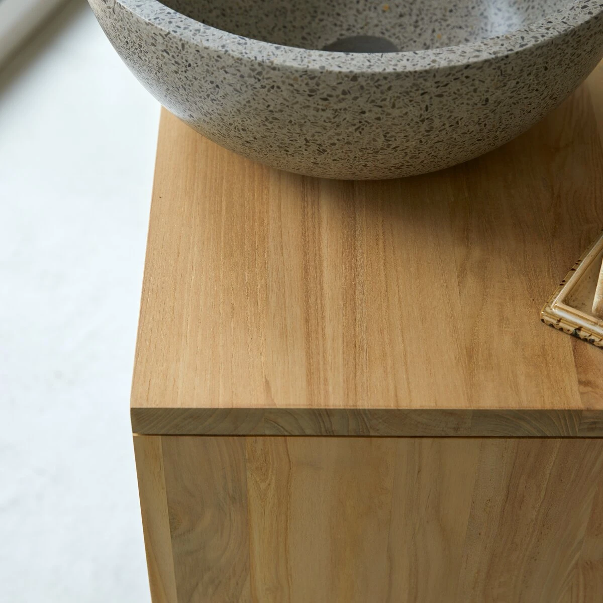 Le meuble sous vasque Kwarto 60 est fabriqué en teck massif brut provenant d’Indonésie. Equipé d’une niche ouverte et d’un tiroir, il sera parfait comme meuble de rangement dans votre salle de bain. Vous serez séduits par son style actuel et ses lignes classiques tout en élégance. Son charme réside également dans sa teinte beige naturelle. Côté pratique, notre meuble offre également un espace inférieur ouvert pour y glisser paniers et boîtes de rangement.