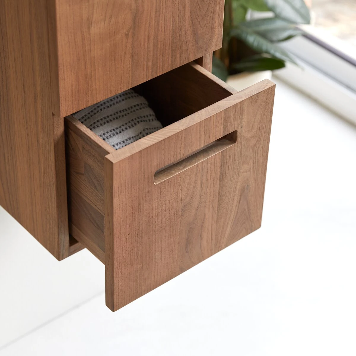La colonne en noyer massif FSC® Line, un meuble tout en sobriĂ©tĂ© qui permet d’organiser avec Ă©lĂ©gance la salle de bain. Si elle complète avec talent notre collection de salle de bain Line, elle peut aussi se jouer seule, associĂ©e Ă des meubles existants ou Ă l’esprit Naturel. Son design tout en puretĂ© et son concept suspendu en font un indispensable du rangement ! Au grĂ© des envies ou des besoins, on place dans les spacieux tiroirs le linge de toilette ou les flacons et dans les niches ouvertes, les objets qu’on aime avoir Ă portĂ©e de regard. Étroite, elle est très peu gourmande en espace pour une belle qualitĂ© de service. IdĂ©ale dans la salle de bain, la colonne en noyer massif Line trouve aussi sa place dans un cabinet de toilette, une chambre ou un bureau. A noter, le système original qui permet l’ouverture des tiroirs.Â