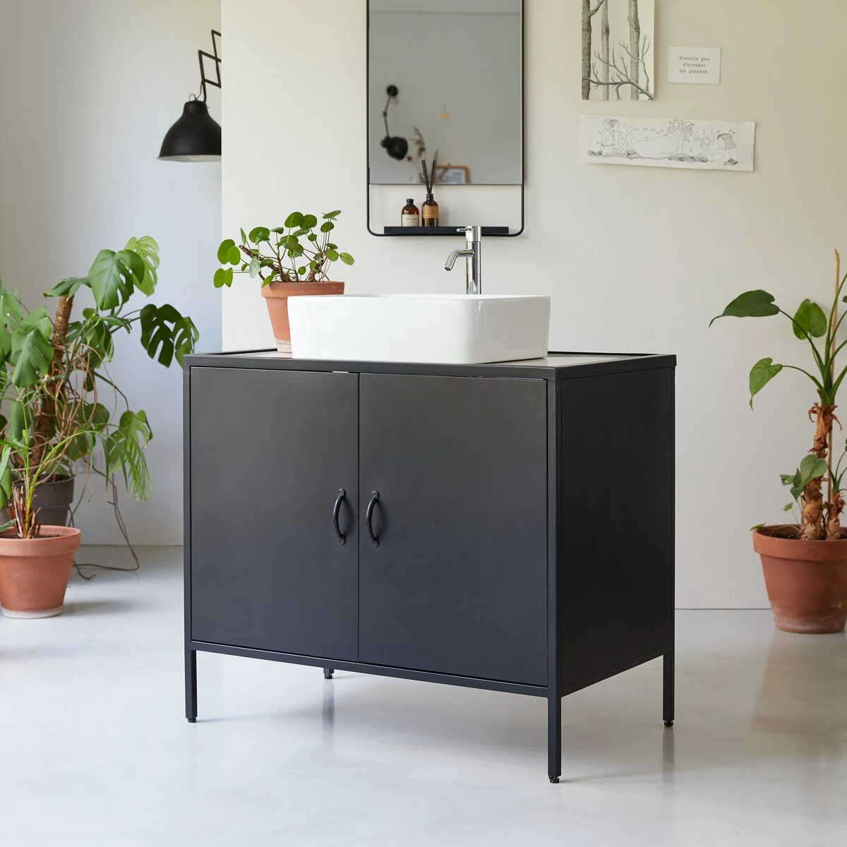 Le meuble de salle de bain en métal et terrazzo réinterprète le style industriel dans une version plus sophistiquée grâce au plateau travaillé dans un matériau noble et très visuel. Conçu pour recevoir une vasque à poser (retrouvez toutes nos vasques à poser), il offre une belle capacité de rangement !