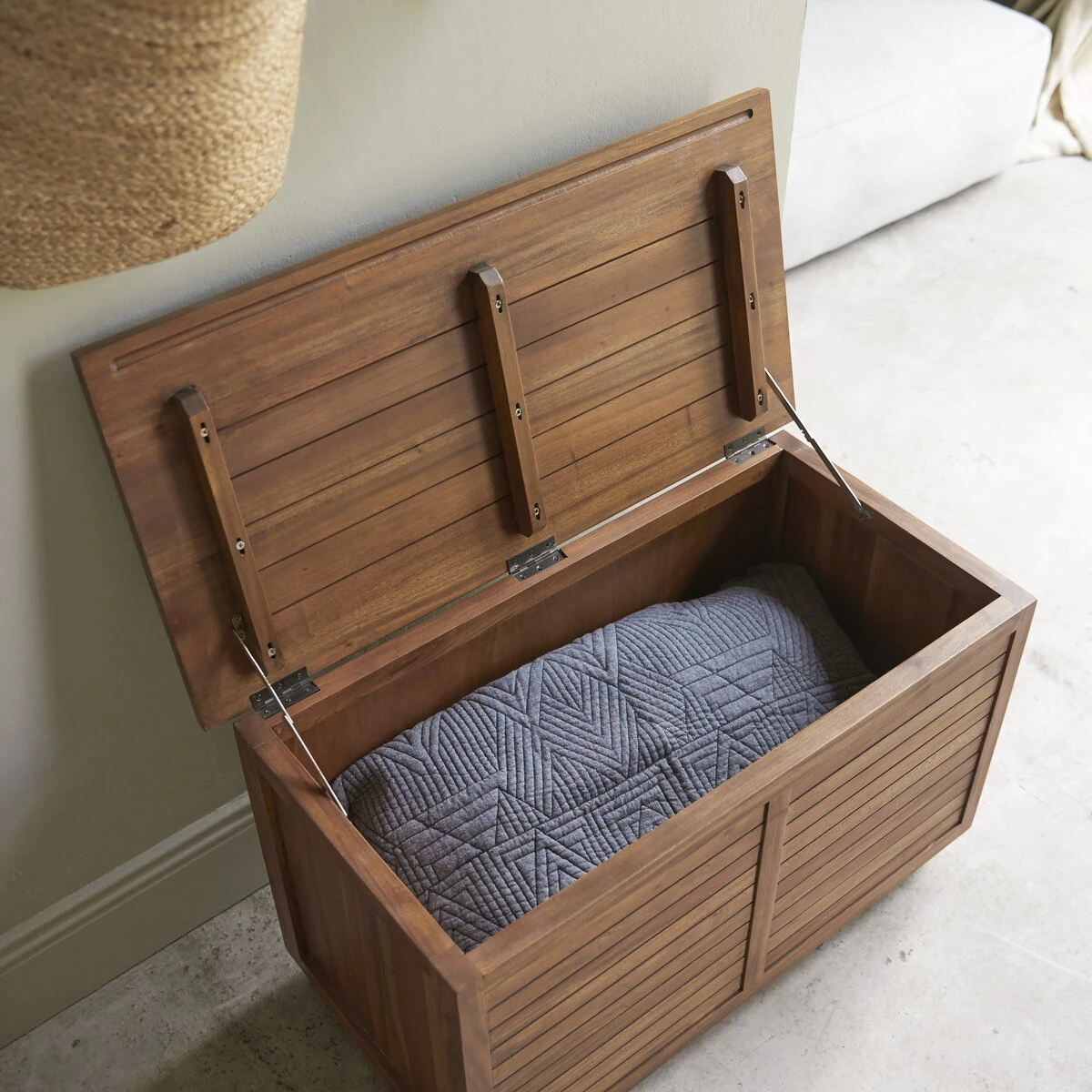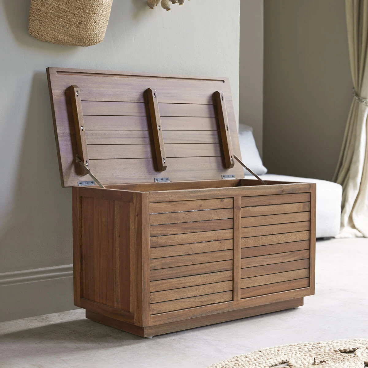 Le coffre en acacia massif certifié FSC® Loggia, un bout de lit très pratique pour ranger draps, couettes et oreillers… qui devient coffre à jouets dans la chambre des enfants, coffre à linge de table au séjour, coffre à tout faire dans la pièce que vous lui choisirez !