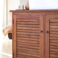 Le meuble de salle de bain en acacia massif certifié FSC® Loggia 97 offre l’authenticité d’un bois massif aux tonalités flamboyantes et le côté graphique de portes lamellées.