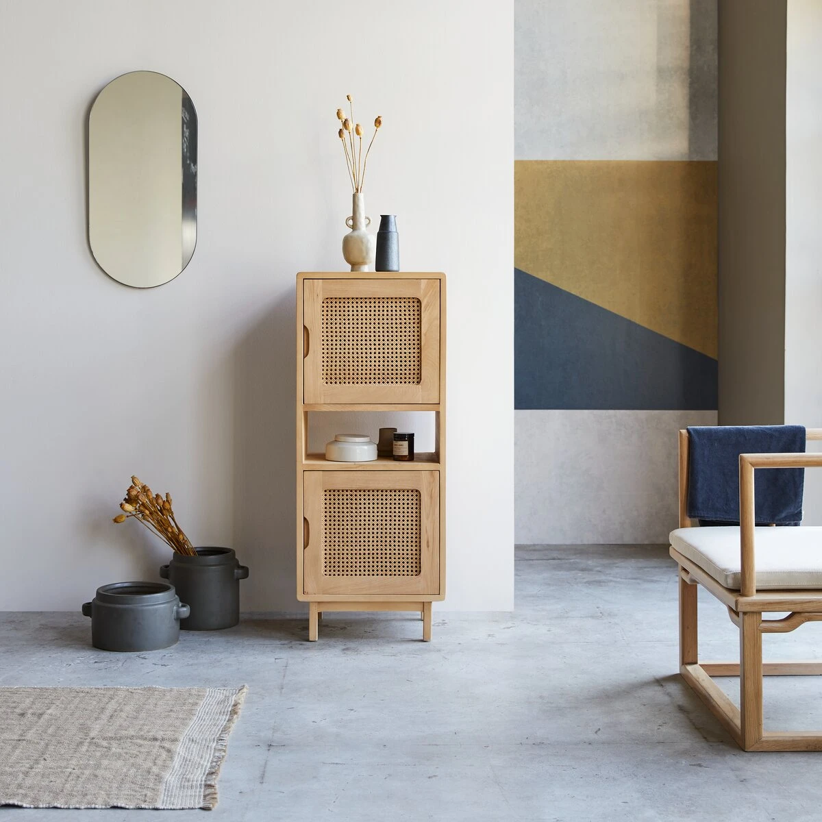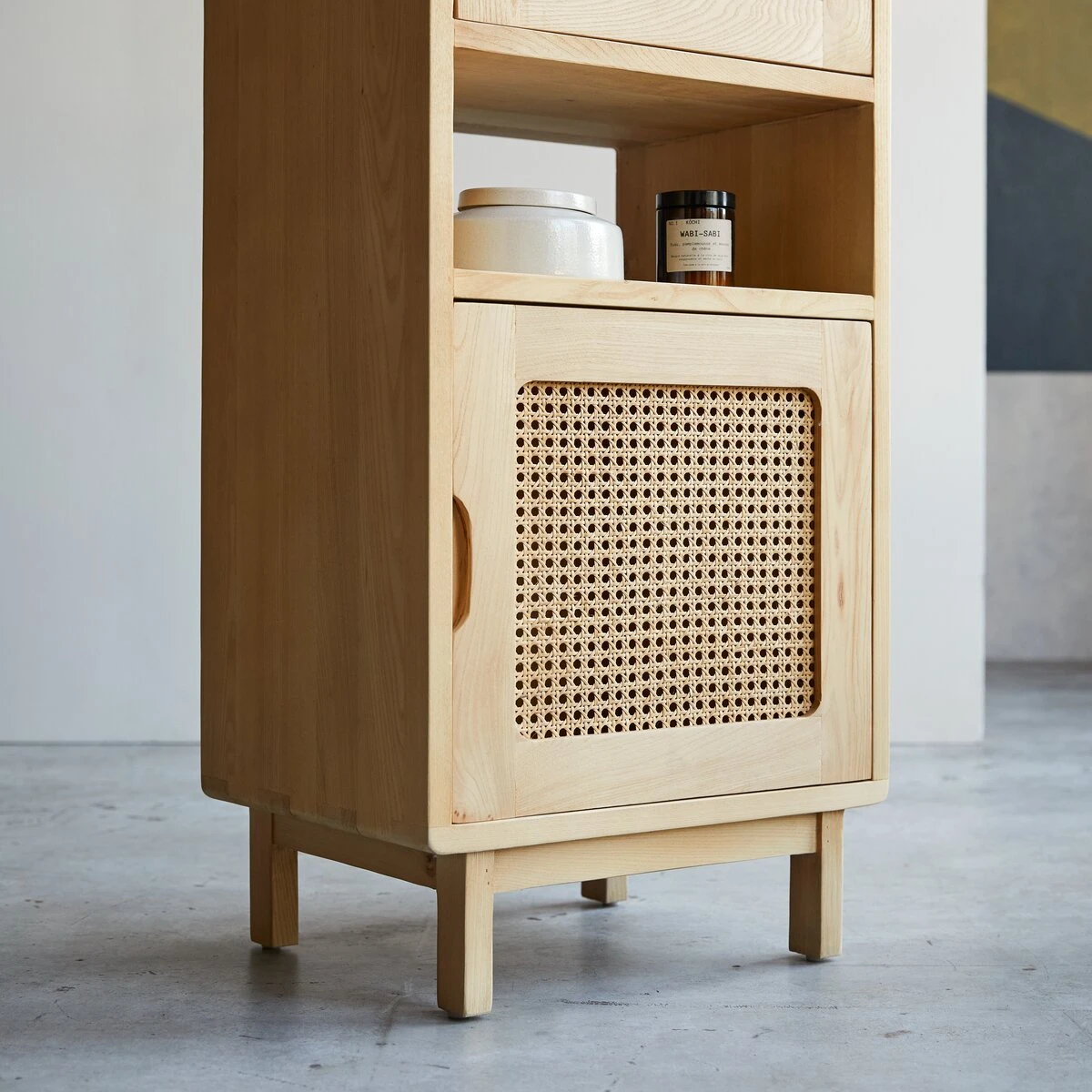 Beaucoup de caractère pour la colonne basse en orme massif et cannage Luis !