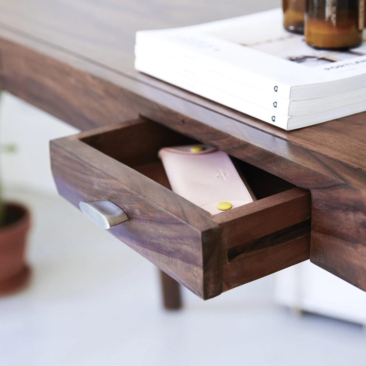 Le bureau en palissandre massif 135 Luna est idéal pour créer un espace de travail plein d’élégance au coeur du séjour, du salon ou de la chambre. On aime le design épuré, le bois veiné et les lignes douces. D’inspiration contemporaine, ce petit meuble trouve sa place partout dans la maison et se marie avec beaucoup d’à -propos à tous les styles de déco. A noter, les deux tiroirs bien pratiques pour y glisser ce qu’on ne veut pas voir traîner sur le plateau !