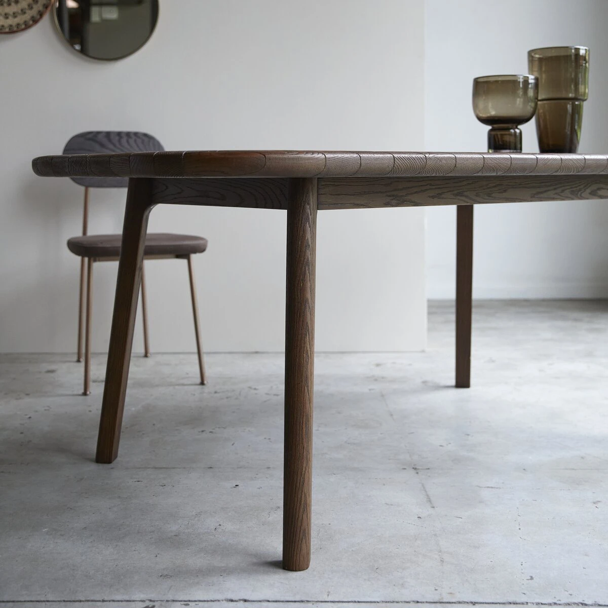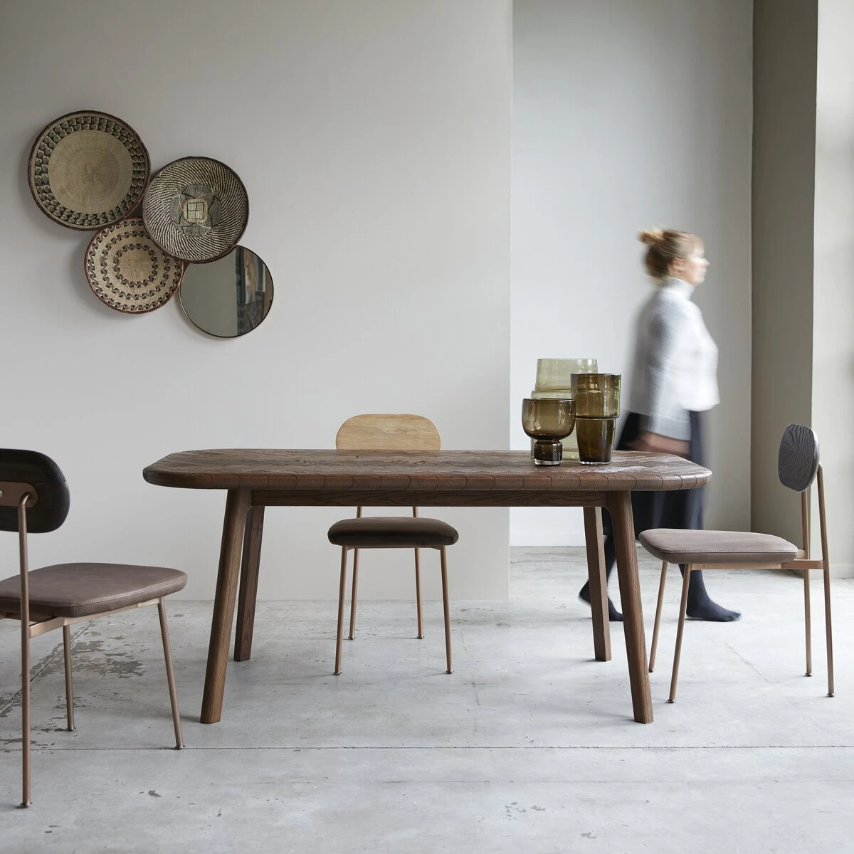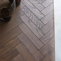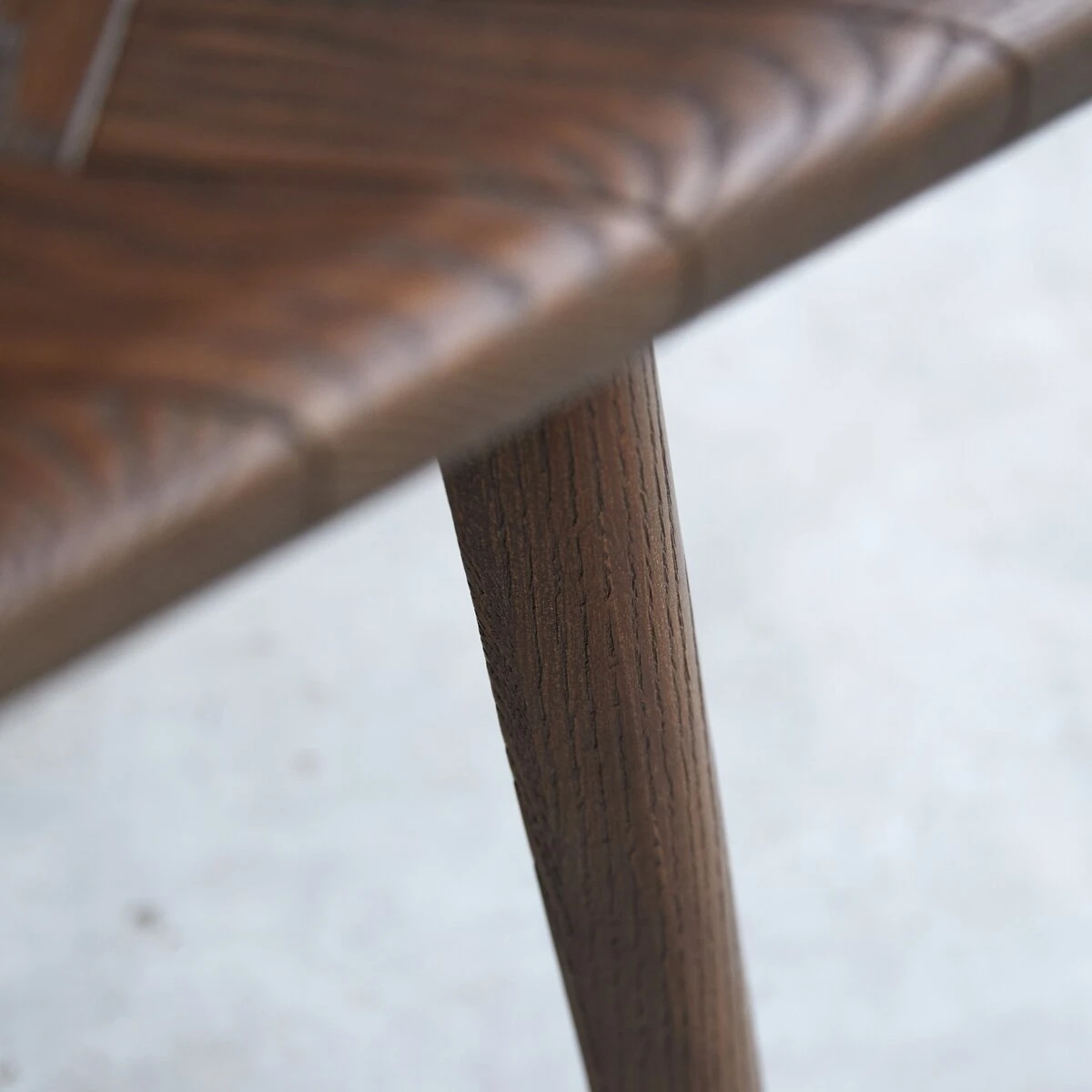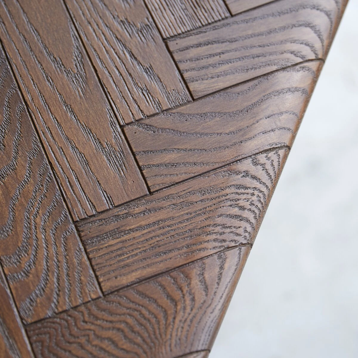 Un plateau magnifiquement travaillĂ© façon chevrons pour la table Mahkah en chĂȘne massif signĂ©e Bleu Nature !