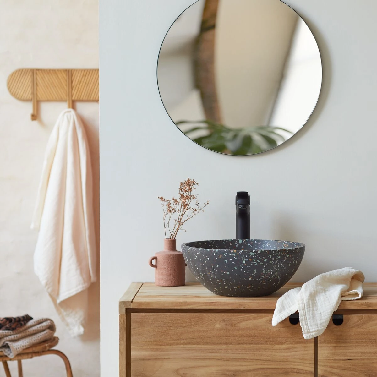 La vasque en terrazzo confetti Micha affiche une ligne toute en courbe, inspirĂ©e de l’art de la table, et un aspect pointillĂ© du plus bel effet ! Il suffit parfois de changer un seul Ă©lĂ©ment pour que votre pièce vive une nouvelle jeunesse : cette vasque en fait une brillante dĂ©monstration… elle est, en effet, idĂ©ale pour rĂ©veiller d’une touche de modernitĂ© toutes les salles de bain et se combine avec rĂ©ussite Ă un meuble clair comme sur notre photo ou foncĂ© pour accentuer l’esprit contemporain. Vernie, elle est vraiment très facile Ă vivre au quotidien.Â