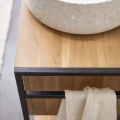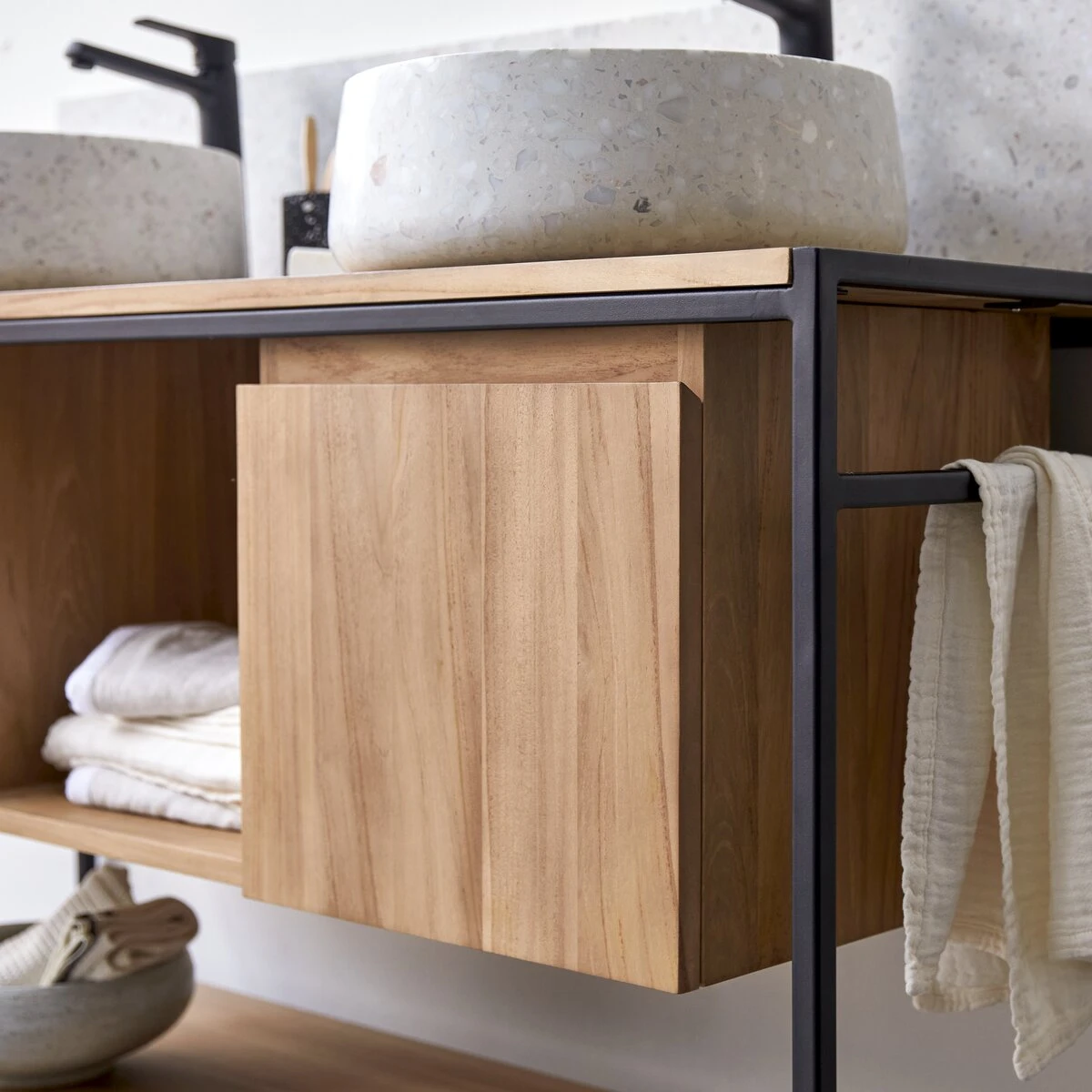 Place Ă l’Ă©lĂ©gance et au style dans la salle de bain … Tikamoon vous prĂ©sente les meubles sous vasque Michal, l’Ă©tonnant mariage du bois de teck certifiĂ© FSCÂź et du mĂ©tal pour un design unique et urbain. Ici, le modĂšle double vasques, pratique notre meuble est idĂ©al pour l’organisation de votre salle de bain, il est Ă©quipĂ© de  multiples espaces de rangement dans lesquels vous pourrez disposer le linge de toute votre famille ainsi que vos produits de soin. GrĂące Ă son plateau conçu pour deux vasques, vous pourrez dorĂ©navant vous prĂ©parez Ă deux, exit les batailles du matin pour une place dans la salle de bain.