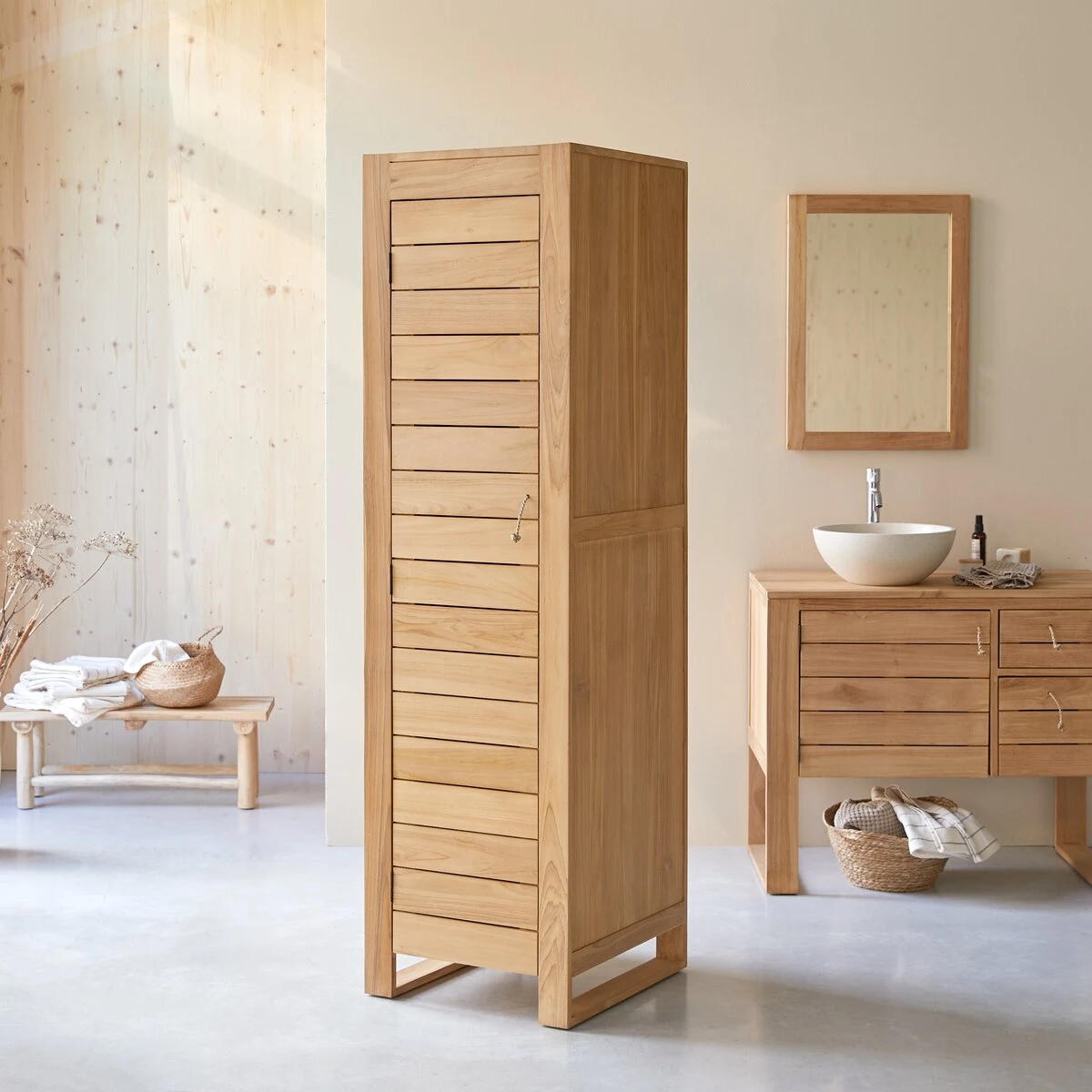 Cette colonne fait partie de la collection Minimalys, une ligne aux douces tonalités mordorées, travaillée dans un teck latté naturel.