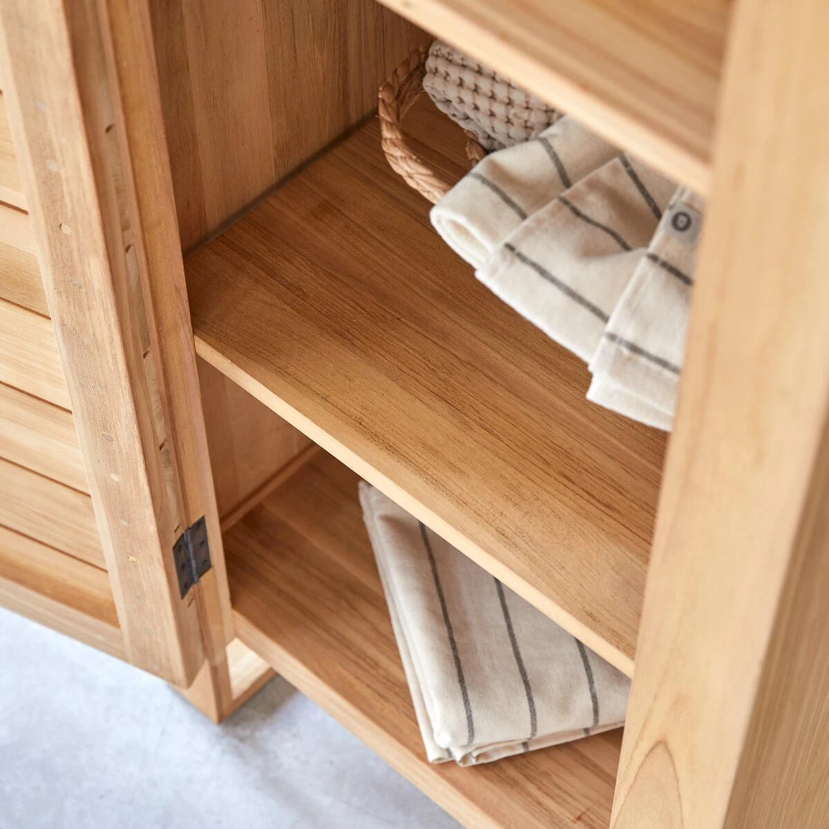 teck massif certifiĂ© FSC® blond et poignĂ©e en corde… comme une invitation voyage pour la colonne de salle de bain en teck 180 Minimalys qui offre une gĂ©nĂ©reuse capacitĂ© de rangement : on y place les serviettes de toilette, les draps de bain et autres tapis. On peut aussi y ranger les produits de beautĂ©, les flacons et tous les Ă©lĂ©ments qu’on ne veut pas voir traĂ®ner dans la salle de bain : les tablettes amovibles permettent d’organiser l’espace au grĂ© des besoins.