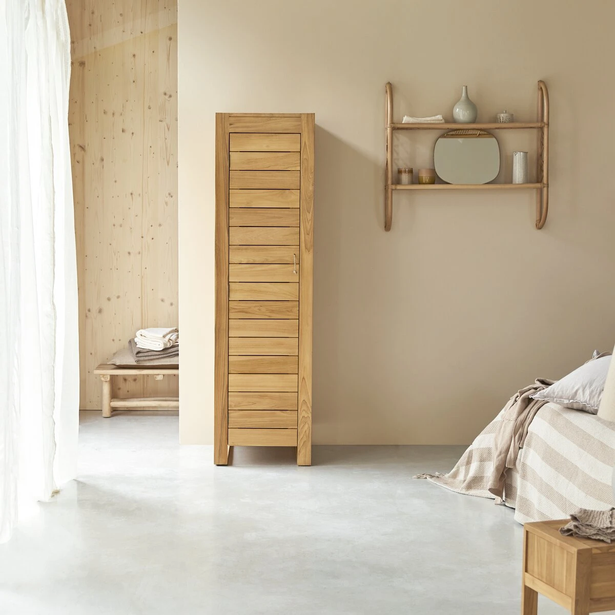 Idéale pour organiser vos vêtements dans la chambre, la colonne MINIMALYS en teck massif certifié FSC® sait aussi se faire une place dans la salle de bain… La sobriété des lignes alliée à la douceur de la tonalité miel vous autorise toutes les associations : vous la combinerez au chevet et au lit MINIMALYS et dans la salle de bain, aux meubles sous vasque (largeur 90 cm ou largeur 145 cm). Vous pourrez aussi décider d’en placer deux dans la chambre des enfants pour séparer le linge d’une fratrie : de dimensions discrètes pour un généreux volume de rangement, elle s’installe partout !