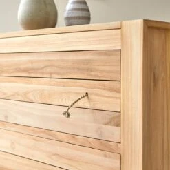 Pureté de lignes et élégance naturelle sont les maîtres mots de la commode de rangement en teck massif Minimalys. On aime la sobriété de son design, la blondeur de son bois aux superbes reflets mordorés et la généreuse capacité de rangement qu’elle propose. Idéale au séjour pour organiser vaisselle et linge de table, elle trouve aussi tout naturellement sa place au salon ou dans une entrée spacieuse. Sa profondeur permet aussi de l’installer dans un couloir où elle recevra tous ces éléments qu’on ne sait jamais vraiment où ranger. Au gré des envies, la commode de rangement peut aussi être installée dans une chambre pour ranger vêtements, livres ou jouets. De très belle facture, ce meuble propose des poignées en corde qui soulignent encore le côté naturel et authentique.