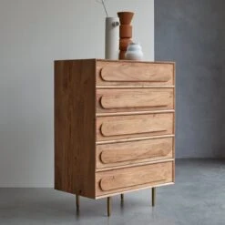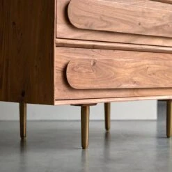 Raffiné et riche de jolis détails, le chiffonnier en acacia massif Olga est idéal pour organiser avec finesse le linge de table ou tous ces accessoires qui ne trouvent jamais vraiment une place définie dans le séjour : fini les objets qui trainent, chaque chose a sa place et une place pour chaque chose… le tout ordonné avec élégance ! On aime le piétement doré du plus bel effet, les découpes subtiles sur les tiroirs et le bois aux veines apparentes très esthétiques.