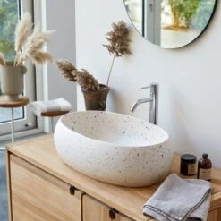 Apportez une pointe d’originalité et de douceur avec notre vasque en terrazzo Orion Confetti. Son design sobre et sophistiqué offrira à votre salle de bain une pointe de modernité allié à l’élégance pour une pièce au style unique.