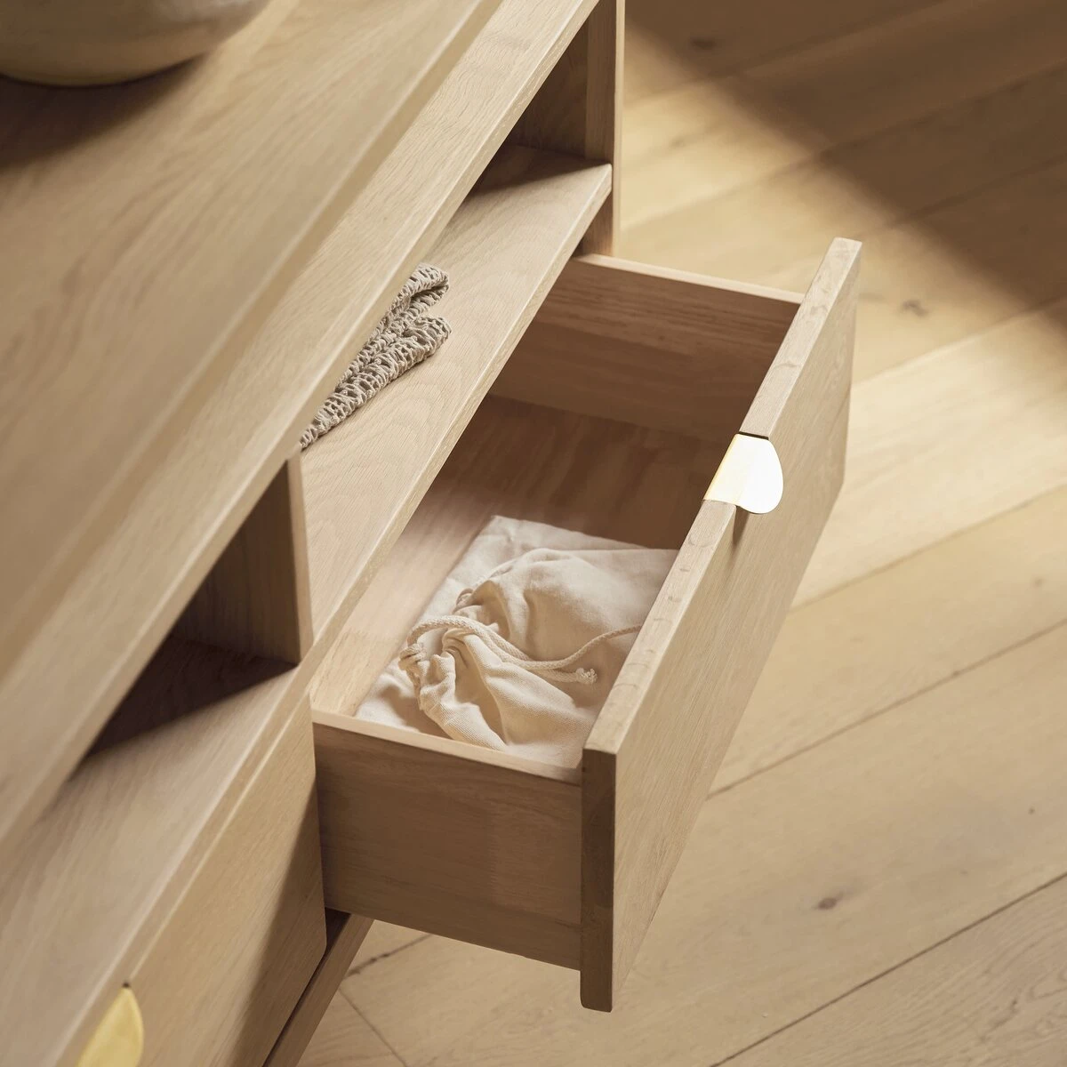 La console en chĂȘne massif Pola se fait petit buffet, banc TV ou meuble dâentrĂ©e, au grĂ© de vos envies ou de vos besoins ! On aime lâinfluence scandinave animĂ©e par des dĂ©tails de modernitĂ© comme le piĂ©tement en diagonale et le plateau surĂ©levĂ©. On aime aussi la niche qui allĂšge visuellement lâensemble. A noter la belle capacitĂ© de rangement organisĂ©e par les deux compartiments et les deux larges tiroirs. EpurĂ©e et design, la console en chĂȘne Pola trouve sa place partout dans la maison : au salon pour les accessoires et autres magazines, au sĂ©jour pour la vaisselle ou le linge de table, au bureau pour les dossiers, dans la chambre pour le petit linge⊠mĂȘme dans lâentrĂ©e pour dĂ©poser sacs et ranger bonnets, gants, chapeaux.