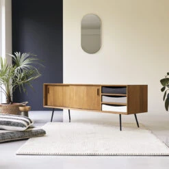 Vous serez séduits par son style simple et sophistiqué. Son design scandinave est caractérisé par ses pieds en métal obliques ainsi que ses lignes géométriques. Son originalité réside dans l’alliance de la teinte du bois ainsi que ses tiroirs colorés qui apportent un contraste élégant entre authenticité et douceur.