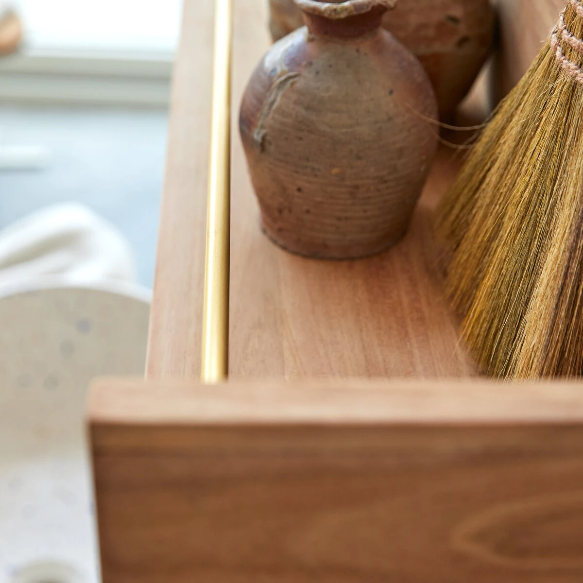 Le teck naturel associĂ© au laiton raffinĂ© composent un bel Ă©lĂ©ment dĂ©co Ă placer dans la salle de bain pour recevoir les jolis flacons de toilette, la brosse, le miroir ou les pots dĂ©co…